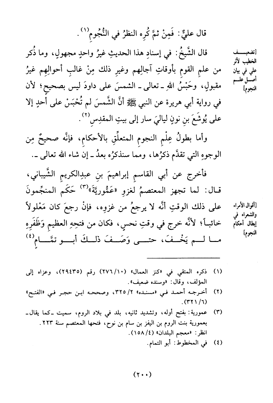 وَأَخْرَجَ عَنِ الْحَسَنِ، أَنَّ قَيْصَرَ، سَأَلَ قُسَّ بْنَ سَاعِدَةَ، قَالَ: " أَخْبِرْنِي هَلْ نَظَرْتَ فِي النُّجُومِ؟ قَالَ: نَعَمْ أَيُّهَا الْمَلِكُ، نَظَرْتُ فِيمَا يُرَادُ بِهِ الْهِدَايَةُ، وَلَمْ أَنْظُرْ فِيمَا يُرَادُ بِهِ الْكِهَانَةُ، وَقَدْ قُلْتُ فِي النُّجُومِ أَبْيَاتًا مِنَ الشِّعْرِ، فَأَنْشَأَ: