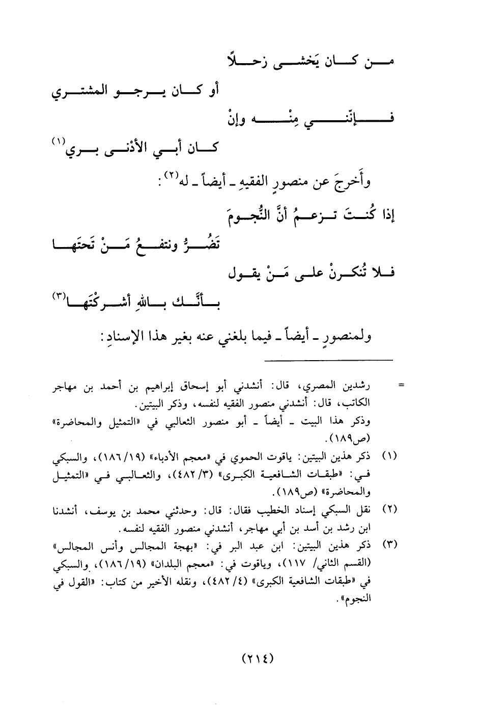 حكيم يرى أَنَّ النُّجُومَ حَقِيقَةٌ ... وَيَذْهَبُ فِي أَحْكَامِهَا كُلَّ مَذْهَبِ