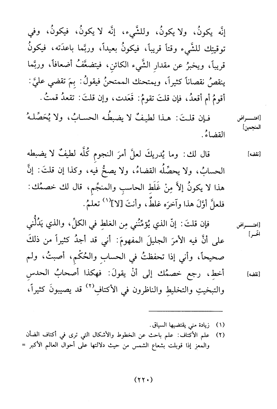 ثُمَّ هَا أَنْتُمْ أَنْفُسِكُمْ قَدِ اخْتَلَفْتُمْ فِيمَا هُوَ أَعْظَمُ ضَرَرًا مِنْ هَذَا وَأَجَلُّ أَمْرًا، وَهُوَ اخْتِلافُكُمْ فِي تَقْوِيمِ الْكَوَاكِبِ بِالزِّيجَاتِ الْمُخْتَلِفَةِ، فَبَعْضُهُمْ يُقَوِّمُهَا بِزِيجِ بَطْلَيْمُوسَ، وَبَعْضُهُمْ يُقَوِّمُهَا بِ «السِّنْدِ هِنْدَ» وَبَعْضُهُمْ يُقَوِّمُهَا بِالْمُمْتَحِنِ، وَإِذَا اخْتَلَفَتْ هَذِهِ الزِّيجَاتُ اخْتَلَفَ الْحِسَابُ، وَإِذَا اخْتَلَفَ الْحِسَابُ اخْتَلَفَتْ مَوَاقِعُ الْكَوَاكِبِ فِي الْبُرُوجِ عِنْدَ الْحِسَابِ، وَإِذَا اخْتَلَفَتْ مَوَاقِعُهَا