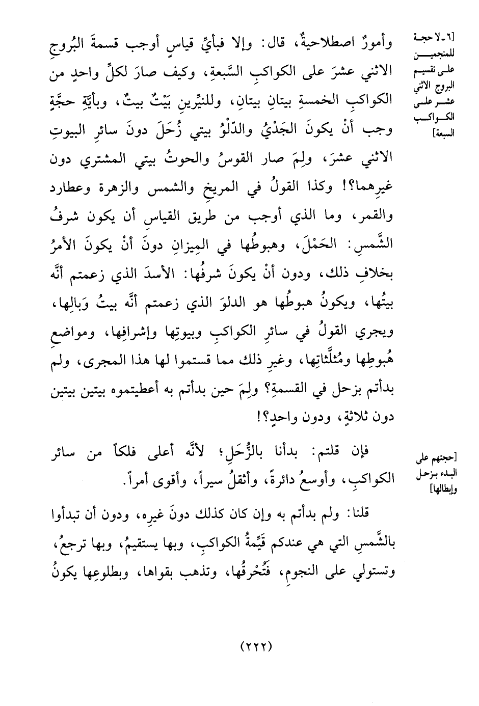 قَالَ الشَّيْخُ: لَوْ لَمْ يَزْهَدِ النَّاسُ فِي النَّظَرِ فِي عِلْمِ النُّجُومِ إِلا مَا تَرَى مِنْ إِكْذَابِ الْعَاقِلِ، وَإِنْجَاحِ الأَحْمَقِ، وَخَيْبَةِ السَّاعِي، وَظَفَرِ الْقَاعِدِ، وَمَا نُشَاهِدُهُ دَائِمًا مِنِ اتِّفَاقَاتِ الْمَنَافِعِ وَالْمَضَارِّ