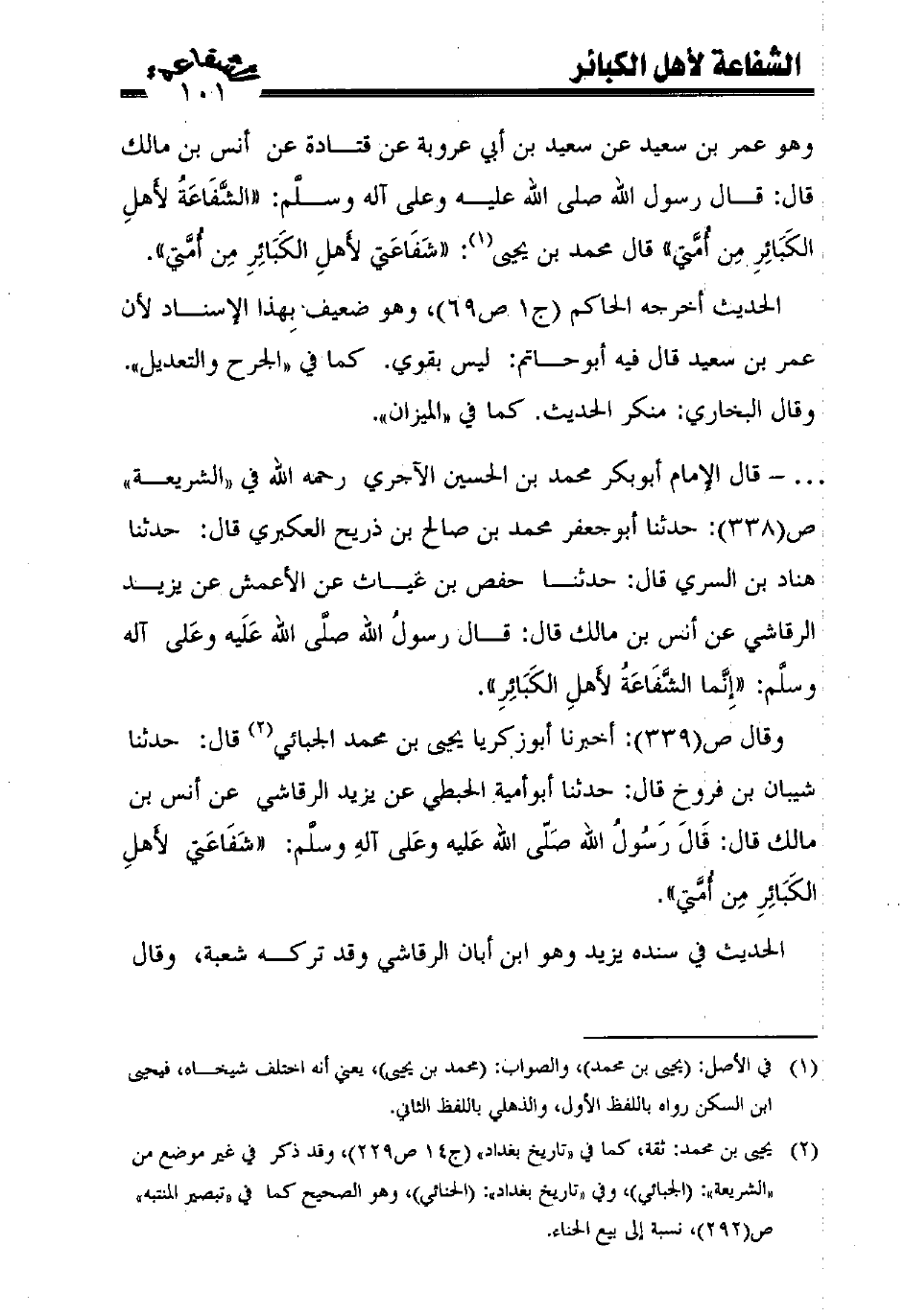 - قال الإمام أبوبكر محمد بن الحسين الآجري رحمه الله في "الشريعة" ص (338): حدثنا أبوجعفر محمد بن صالح بن ذريح العكبري قال: حدثنا هناد بن السري قال: حدثنا حفص بن غياث عن الأعمش عن يزيد الرقاشي عن أنس بن مالك قال: قال رسول الله صلّى الله عليه وعلى آله وسلّم: ((إنّما الشّفاعة لأهل الكبائر)).