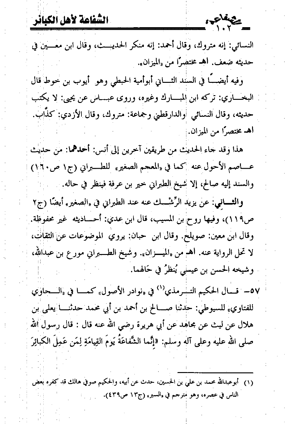 57 - قال الحكيم الترمذي (¬1) في "نوادر الأصول" كما في "الحاوي للفتاوي" للسيوطي: حدثنا صالح بن أحمد بن أبي محمد حدثنا يعلى بن هلال عن ليث عن مجاهد عن أبي هريرة رضي الله عنه قال: قال رسول الله صلى الله عليه وعلى آله وسلم: ((إنّما الشّفاعة يوم القيامة لمن عمل الكبائر