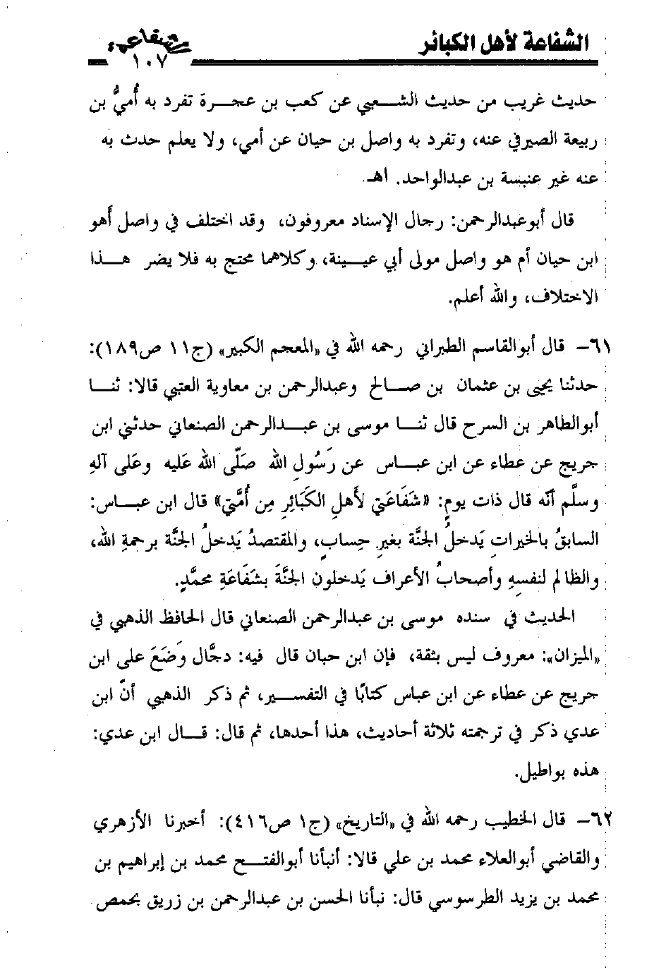 61 - قال أبوالقاسم الطبراني رحمه الله في "المعجم الكبير" (ج11 ص189): حدثنا يحيى بن عثمان بن صالح وعبد الرحمن بن معاوية العتبي قالا: ثنا أبوالطاهر بن السرح قال ثنا موسى بن عبد الرحمن الصنعاني حدثني ابن جريج عن عطاء عن ابن عباس عن رسول الله صلّى الله عليه وعلى آله وسلّم أنّه قال ذات يوم: ((شفاعتي لأهل الكبائر من أمّتي)) قال ابن عباس: السابق بالخيرات يدخل الجنّة بغير حساب، والمقتصد يدخل الجنّة برحمة الله، والظالم لنفسه وأصحاب الأعراف يدخلون الجنّة بشفاعة محمّد.