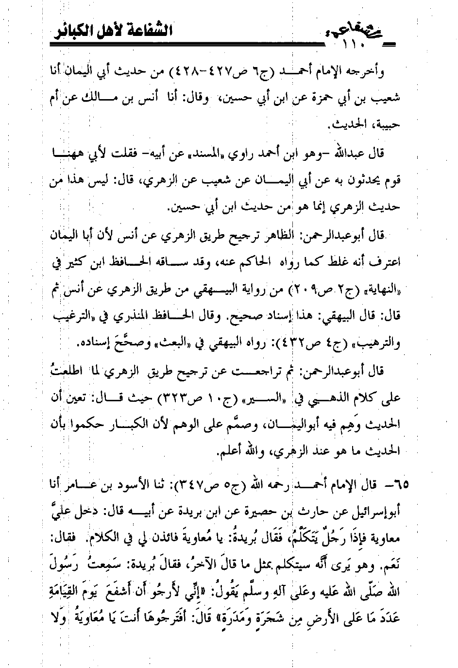65 - قال الإمام أحمد رحمه الله (ج5 ص347): ثنا الأسود بن عامر أنا أبوإسرائيل عن حارث بن حصيرة عن ابن بريدة عن أبيه قال: دخل عليّ معاوية فإذا رجل يتكلّم، فقال بريدة: يا معاوية فائذن لي في الكلام. فقال: نعم. وهو يرى أنّه سيتكلم بمثل ما قال الآخر، فقال بريدة: سمعت رسول الله صلّى الله عليه وعلى آله وسلّم يقول: ((إنّي لأرجو أن أشفع يوم القيامة عدد ما على الأرض من شجرة ومدرة)) قال: أفترجوها أنت يا معاوية ولا