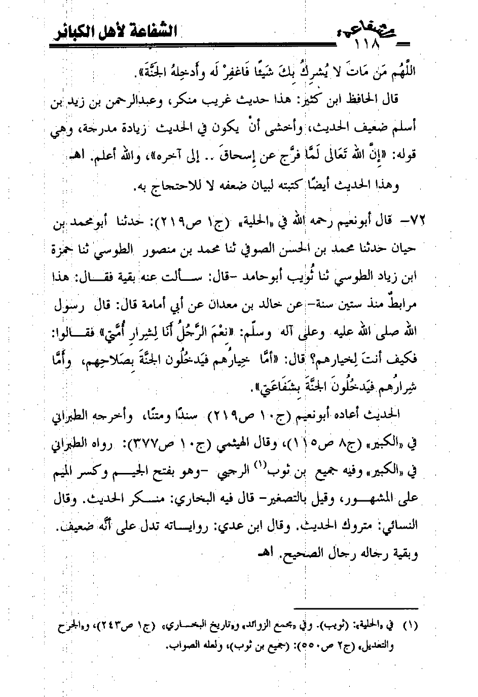 72 - قال أبونعيم رحمه الله في "الحلية" (ج1 ص219): حدثنا أبومحمد بن حيان حدثنا محمد بن الحسن الصوفي ثنا محمد بن منصور الطوسي ثنا حمزة ابن زياد الطوسي ثنا ثويب أبوحامد -قال: سألت عنه بقية فقال: هذا مرابط منذ ستين سنة- عن خالد بن معدان عن أبي أمامة قال: قال رسول الله صلى الله عليه وعلى آله وسلّم: ((نعْم الرّجل أنا لشرار أمّتي)) فقالوا: فكيف أنت لخيارهم؟ قال: ((أمّا خيارهم فيدخلون الجنّة بصلاحهم، وأمّا شرارهم فيدخلون الجنّة بشفاعتي)).