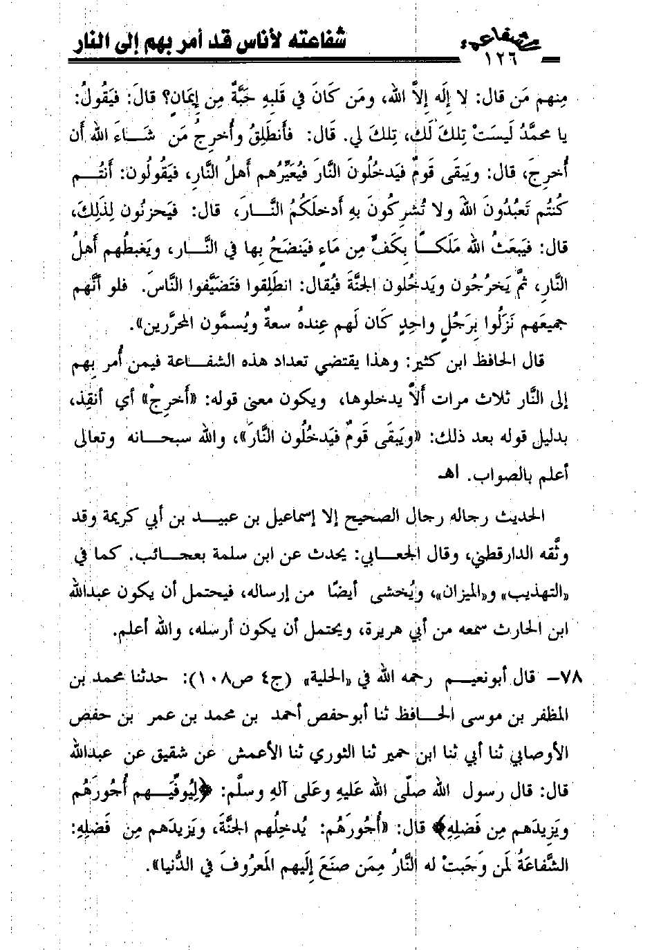 78 - قال أبونعيم رحمه الله في "الحلية" (ج4 ص108): حدثنا محمد بن المظفر بن موسى الحافظ ثنا أبوحفص أحمد بن محمد بن عمر بن حفص الأوصابي ثنا أبي ثنا ابن حمير ثنا الثوري ثنا الأعمش عن شقيق عن عبد الله قال: قال رسول الله صلّى الله عليه وعلى آله وسلّم: {ليوفّيهم أجورهم ويزيدهم من فضله} قال: ((أجورهم: يدخلهم الجنّة، ويزيدهم من فضله: الشّفاعة لمن وجبتْ له النّار ممن صنع إليهم المعروف في الدّنيا)).