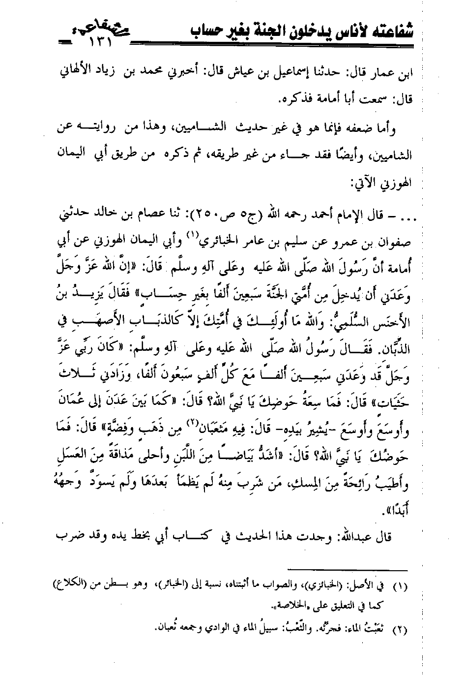 - قال الإمام أحمد رحمه الله (ج5 ص250): ثنا عصام بن خالد حدثني صفوان بن عمرو عن سليم بن عامر الخبائري (¬1) وأبي اليمان الهوزني عن أبي أمامة أنّ رسول الله صلّى الله عليه وعلى آله وسلّم قال: ((إنّ الله عزّ وجلّ وعدني أن يدخل من أمّتي الجنّة سبعين ألفًا بغير حساب)) فقال يزيد بن الأخنس السّلميّ: والله ما أولئك في أمّتك إلاّ كالذباب الأصهب في الذّبّان. فقال رسول الله صلّى الله عليه وعلى آله وسلّم: ((كان ربّي عزّ وجلّ قد وعدني سبعين ألفًا مع كلّ ألف سبعون ألفًا، وزادني ثلاث حثيات)) قال: فما سعة حوضك يا نبيّ الله؟ قال: ((كما بين عدن إلى عمان وأوسع وأوسع -يشير بيده- قال: فيه مثعبان (¬2) من ذهب وفضّة)) قال: فما حوضك يا نبيّ الله؟ قال: ((أشدّ بياضًا من اللّبن وأحلى مذاقةً من العسل وأطيب رائحةً من المسك، من شرب منه لم يظمأ بعدها ولم يسودّ وجهه أبدًا)).
