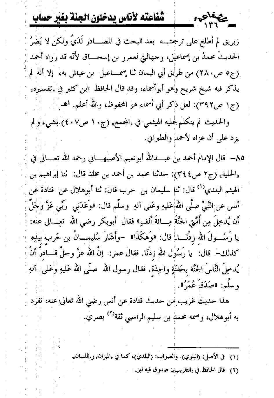 85 - قال الإمام أحمد بن عبد الله أبونعيم الأصبهاني رحمه الله تعالى في "الحلية" (ج2 ص344): حدثنا محمد بن أحمد بن مخلد قال: ثنا إبراهيم بن الهيثم البلدي (¬1) قال: ثنا سليمان بن حرب قال: ثنا أبوهلال عن قتادة عن أنس عن النّبيّ صلّى الله عليه وعلى آله وسلّم قال: ((وعدني ربّي عزّ وجلّ أن يدخل من أمّتي الجنّة مائة ألف)) فقال أبوبكر رضي الله تعالى عنه: يا رسول الله زدْنا. قال: ((وهكذا)) -وأشار سليمان بن حرب بيده كذلك- قال: يا رسول الله زدْنا. فقال عمر: إنّ الله عزّ وجلّ قادر أنْ يدخل النّاس الجنّة بحفنة واحدة. فقال رسول الله صلّى الله عليه وعلى آله وسلّم: ((صدق عمر)).