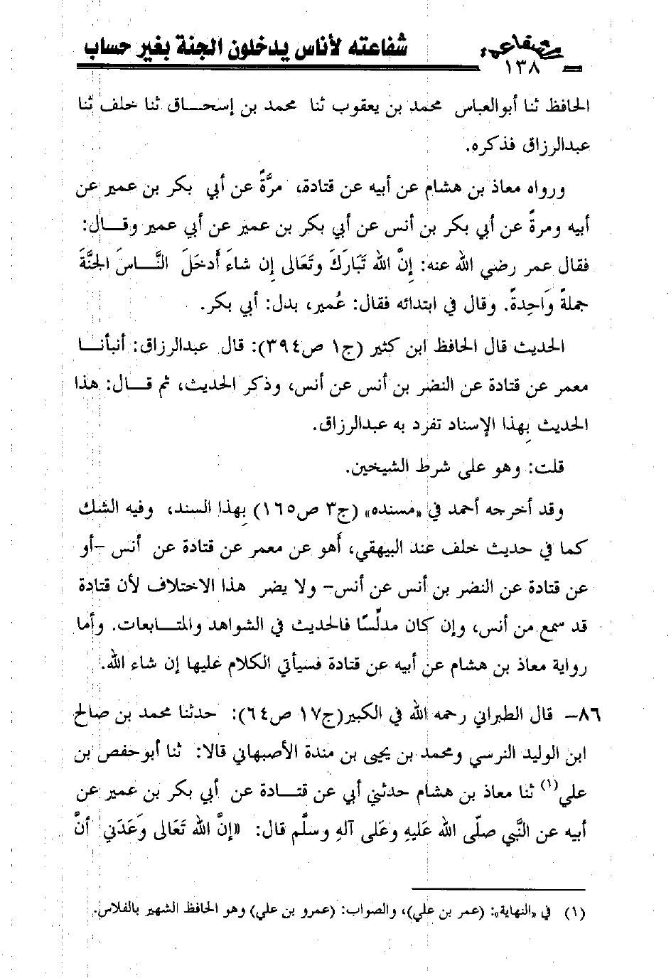 ورواه معاذ بن هشام عن أبيه عن قتادة، مرّةً عن أبي بكر بن عمير عن أبيه ومرةً عن أبي بكر بن أنس عن أبي بكر بن عمير عن أبي عمير وقال: فقال عمر رضي الله عنه: إنّ الله تبارك وتعالى إن شاء أدخل النّاس الجنّة جملةً واحدةً. وقال في ابتدائه فقال: عمير، بدل: أبي بكر.