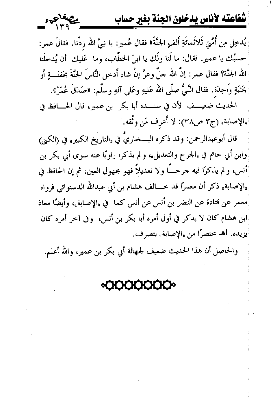 قال أبوعبد الرحمن: وقد ذكره البخاريّ في "التاريخ الكبير" في (الكنى) وابن أبي حاتم في "الجرح والتعديل"، ولم يذكرا راويًا عنه سوى أبي بكر بن أنس، ولم يذكرا فيه جرحًا ولا تعديلاً فهو مجهول العين، ثم إن الحافظ في "الإصابة" ذكر أن معمرًا قد خالف هشام بن أبي عبد الله الدستوائي فرواه معمر عن قتادة عن النضر بن أنس عن أنس كما في "الإصابة"، وأيضًا معاذ ابن هشام كان لا يذكر في أول أمره أبا بكر بن أنس، وفي آخر أمره كان يزيده. اهـ مختصرًا من "الإصابة" بتصرف.