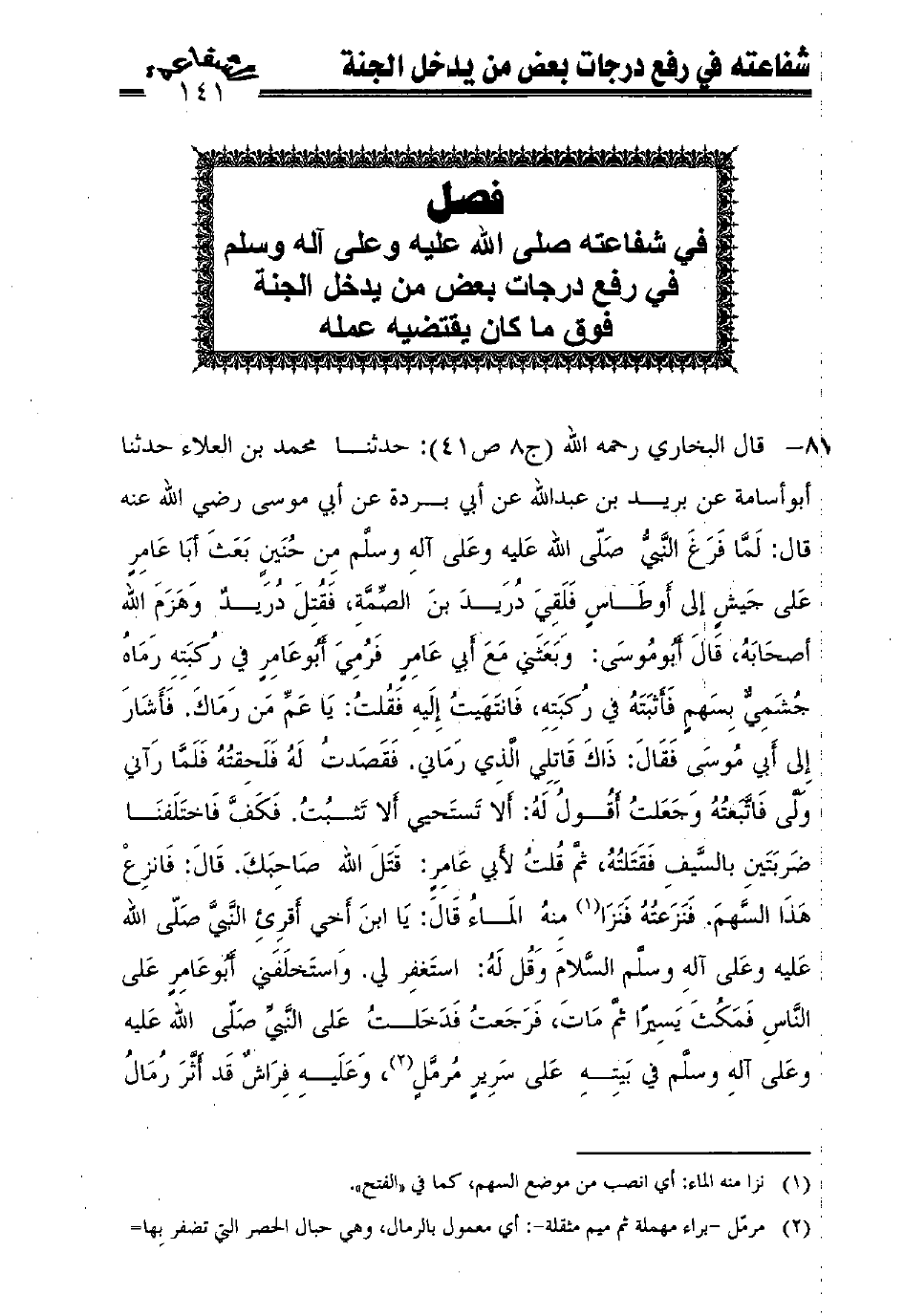 87 - قال البخاري رحمه الله (ج8 ص41): حدثنا محمد بن العلاء حدثنا أبوأسامة عن بريد بن عبد الله عن أبي بردة عن أبي موسى رضي الله عنه قال: لمّا فرغ النّبيّ صلّى الله عليه وعلى آله وسلّم من حنين بعث أبا عامر على جيش إلى أوطاس فلقي دريد بن الصّمّة، فقتل دريد وهزم الله أصحابه، قال أبوموسى: وبعثني مع أبي عامر فرمي أبوعامر في ركبته رماه جشميّ بسهم فأثبته في ركبته، فانتهيت إليه فقلت: يا عمّ من رماك. فأشار إلى أبي موسى فقال: ذاك قاتلي الّذي رماني. فقصدت له فلحقته فلمّا رآني ولّى فاتّبعته وجعلت أقول له: ألا تستحيي ألا تثبت. فكفّ فاختلفنا ضربتين بالسّيف فقتلته، ثمّ قلت لأبي عامر: قتل الله صاحبك. قال: فانزعْ هذا السّهم. فنزعته فنزا (¬1) منه الماء قال: يا ابن أخي أقرئ النّبيّ صلّى الله عليه وعلى آله وسلّم السّلام وقل له: استغفر لي. واستخلفني أبوعامر على النّاس فمكث يسيرًا ثمّ مات، فرجعت فدخلت على النّبيّ صلّى الله عليه وعلى آله وسلّم في بيته على سرير مرمّل (¬2)، وعليه فراش قد أثّر رمال