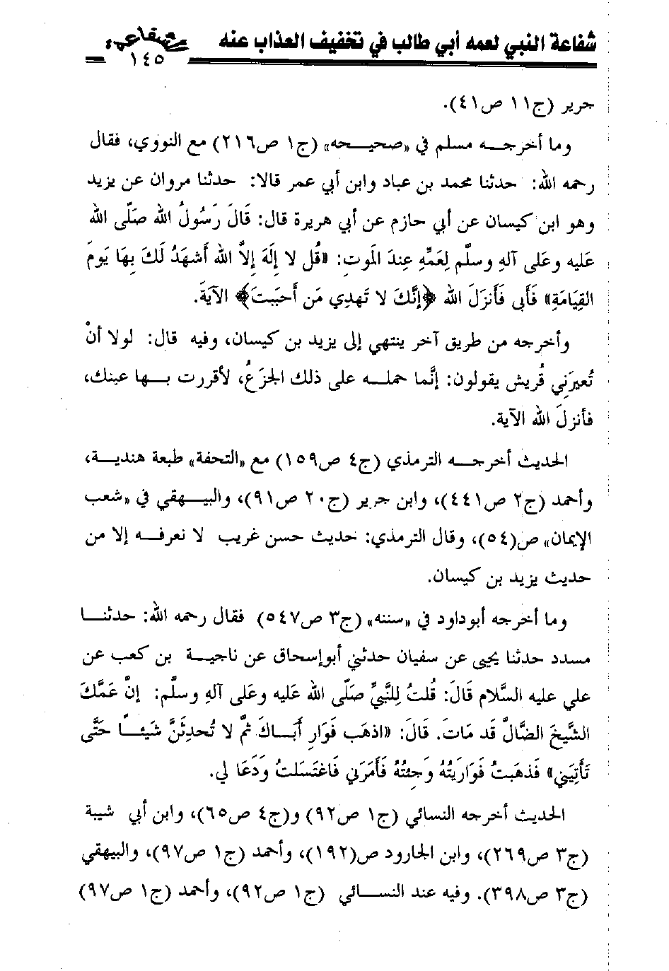 وما أخرجه مسلم في "صحيحه" (ج1 ص216) مع النووي، فقال رحمه الله: حدثنا محمد بن عباد وابن أبي عمر قالا: حدثنا مروان عن يزيد وهو ابن كيسان عن أبي حازم عن أبي هريرة قال: قال رسول الله صلّى الله عليه وعلى آله وسلّم لعمّه عند الموت: ((قل لا إله إلاّ الله أشهد لك بها يوم القيامة)) فأبى فأنزل الله {إنّك لا تهدي من أحببت} الآية.