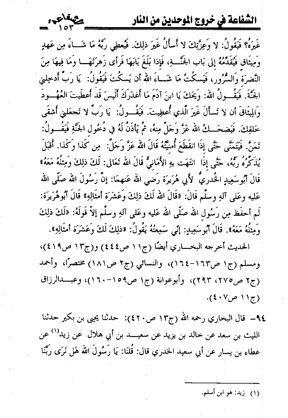 94 - قال البخاري رحمه الله (ج13 ص420): حدثنا يحيى بن بكير حدثنا الليث بن سعد عن خالد بن يزيد عن سعيد بن أبي هلال عن زيد (¬1) عن عطاء بن يسار عن أبي سعيد الخدري قال: قلنا: يا رسول الله هل نرى ربّنا