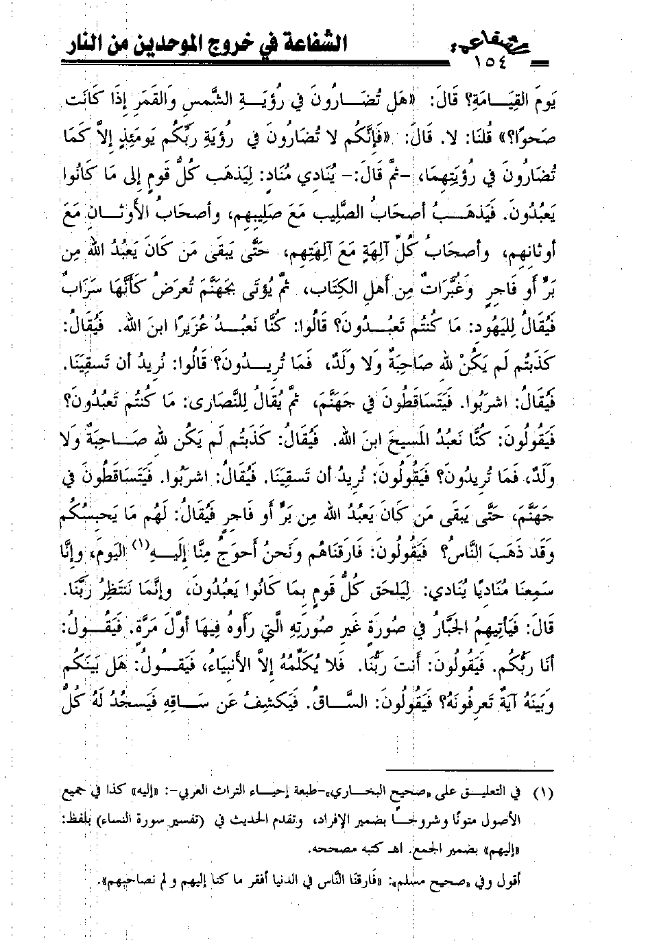 يوم القيامة؟ قال: ((هل تضارون في رؤية الشّمس والقمر إذا كانت صحوًا؟)) قلنا: لا. قال: ((فإنّكم لا تضارون في رؤية ربّكم يومئذ إلاّ كما تضارون في رؤيتهما، -ثمّ قال:- ينادي مناد: ليذهب كلّ قوم إلى ما كانوا يعبدون. فيذهب أصحاب الصّليب مع صليبهم، وأصحاب الأوثان مع أوثانهم، وأصحاب كلّ آلهة مع آلهتهم، حتّى يبقى من كان يعبد الله من برّ أو فاجر وغبّرات من أهل الكتاب، ثمّ يؤتى بجهنّم تعرض كأنّها سراب فيقال لليهود: ما كنتم تعبدون؟ قالوا: كنّا نعبد عزيرًا ابن الله. فيقال: كذبتم لم يكنْ لله صاحبة ولا ولد، فما تريدون؟ قالوا: نريد أن تسقينا. فيقال: اشربوا. فيتساقطون في جهنّم، ثمّ يقال للنّصارى: ما كنتم تعبدون؟ فيقولون: كنّا نعبد المسيح ابن الله. فيقال: كذبتم لم يكن لله صاحبة ولا ولد، فما تريدون؟ فيقولون: نريد أن تسقينا. فيقال: اشربوا. فيتساقطون في جهنّم، حتّى يبقى من كان يعبد الله من برّ أو فاجر فيقال: لهم ما يحبسكم وقد ذهب النّاس؟ فيقولون: فارقناهم ونحن أحوج منّا إليه (¬1) اليوم، وإنّا سمعنا مناديًا ينادي: ليلحق كلّ قوم بما كانوا يعبدون، وإنّما ننتظر ربّنا. قال: فيأتيهم الجبّار في صورة غير صورته الّتي رأوه فيها أوّل مرّة. فيقول: أنا ربّكم. فيقولون: أنت ربّنا. فلا يكلّمه إلاّ الأنبياء، فيقول: هل بينكم وبينه آية تعرفونه؟ فيقولون: السّاق.