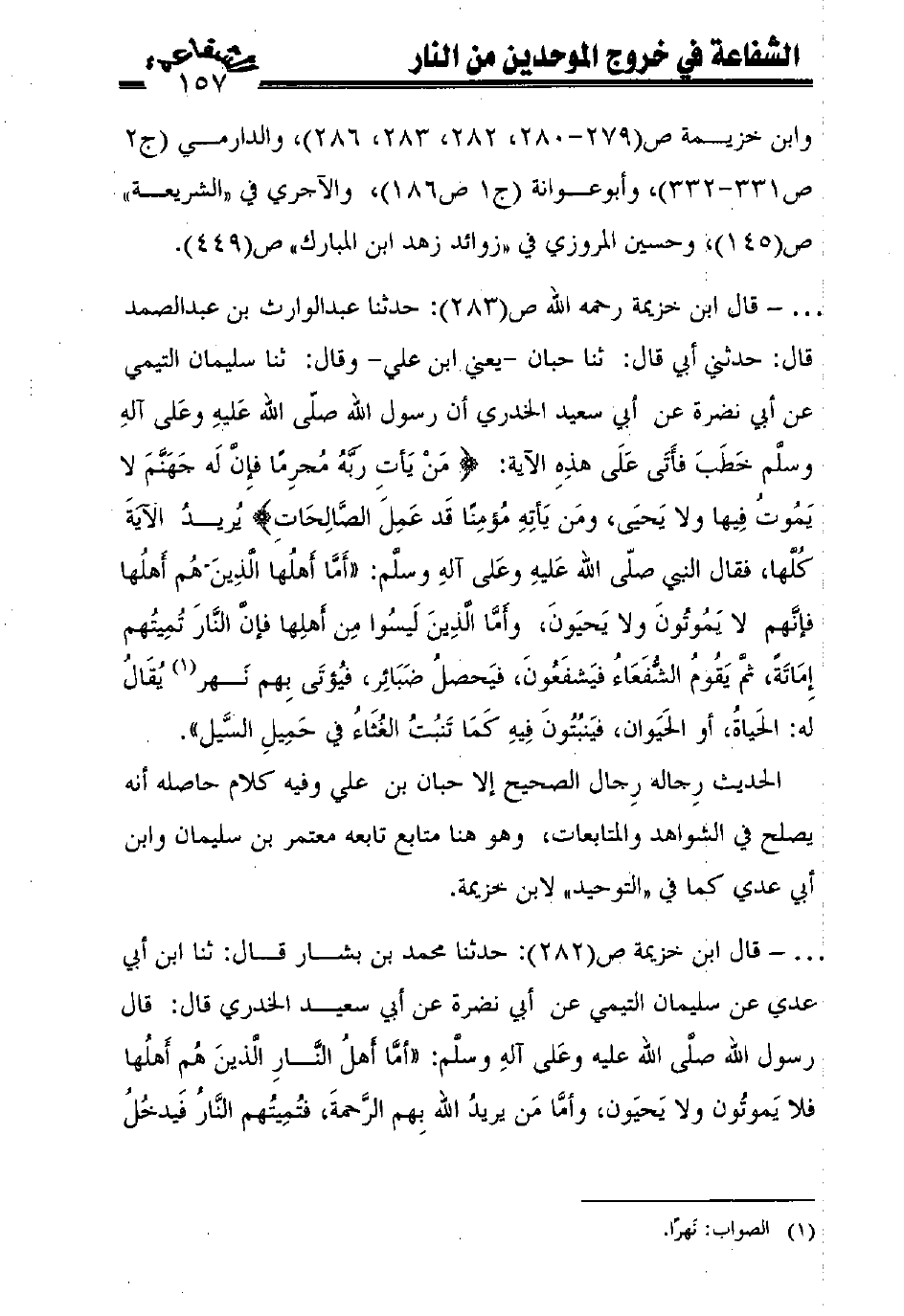 - قال ابن خزيمة ص (282): حدثنا محمد بن بشار قال: ثنا ابن أبي عدي عن سليمان التيمي عن أبي نضرة عن أبي سعيد الخدري قال: قال رسول الله صلّى الله عليه وعلى آله وسلّم: ((أمّا أهل النّار الّذين هم أهلها فلا يموتون ولا يحيون، وأمّا من يريد الله بهم الرّحمة، فتميتهم النّار فيدخل