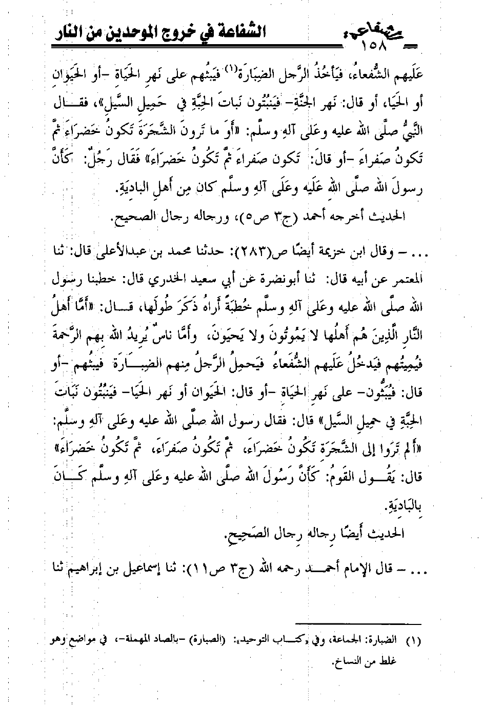 - وقال ابن خزيمة أيضًا ص (283): حدثنا محمد بن عبد الأعلى قال: ثنا المعتمر عن أبيه قال: ثنا أبونضرة عن أبي سعيد الخدري قال: خطبنا رسول الله صلّى الله عليه وعلى آله وسلّم خطبةً أراه ذكر طولها، قال: ((أمّا أهل النّار الّذين هم أهلها لا يموتون ولا يحيون، وأمّا ناس يريد الله بهم الرّحمة فيميتهم فيدخل عليهم الشّفعاء فيحمل الرّجل منهم الضبارة فيبثهم -أو قال: فيبثّون- على نهر الحياة -أو قال: الحيوان أو نهر الحيا- فينبتون نبات الحبّة في حميل السّيل)) قال: فقال رسول الله صلّى الله عليه وعلى آله وسلّم: ((ألم تروا إلى الشّجرة تكون خضراء، ثمّ تكون صفراء، ثمّ تكون خضراء)) قال: يقول القوم: كأنّ رسول الله صلّى الله عليه وعلى آله وسلّم كان بالبادية.