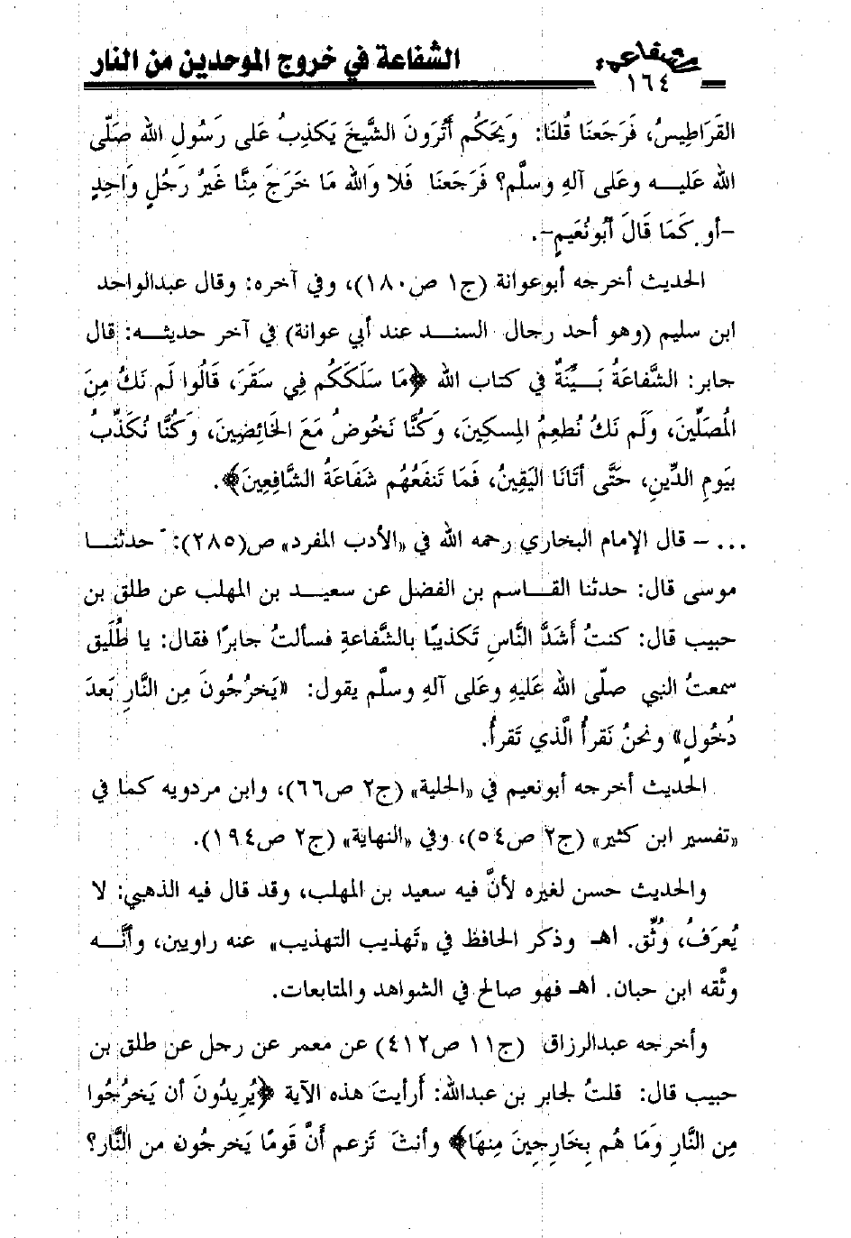- قال الإمام البخاري رحمه الله في "الأدب المفرد" ص (285): حدثنا موسى قال: حدثنا القاسم بن الفضل عن سعيد بن المهلب عن طلق بن حبيب قال: كنت أشدّ النّاس تكذيبًا بالشّفاعة فسألت جابرًا فقال: يا طليق سمعت النبي صلّى الله عليه وعلى آله وسلّم يقول: ((يخرجون من النّار بعد دخول)) ونحن نقرأ الّذي تقرأ.
