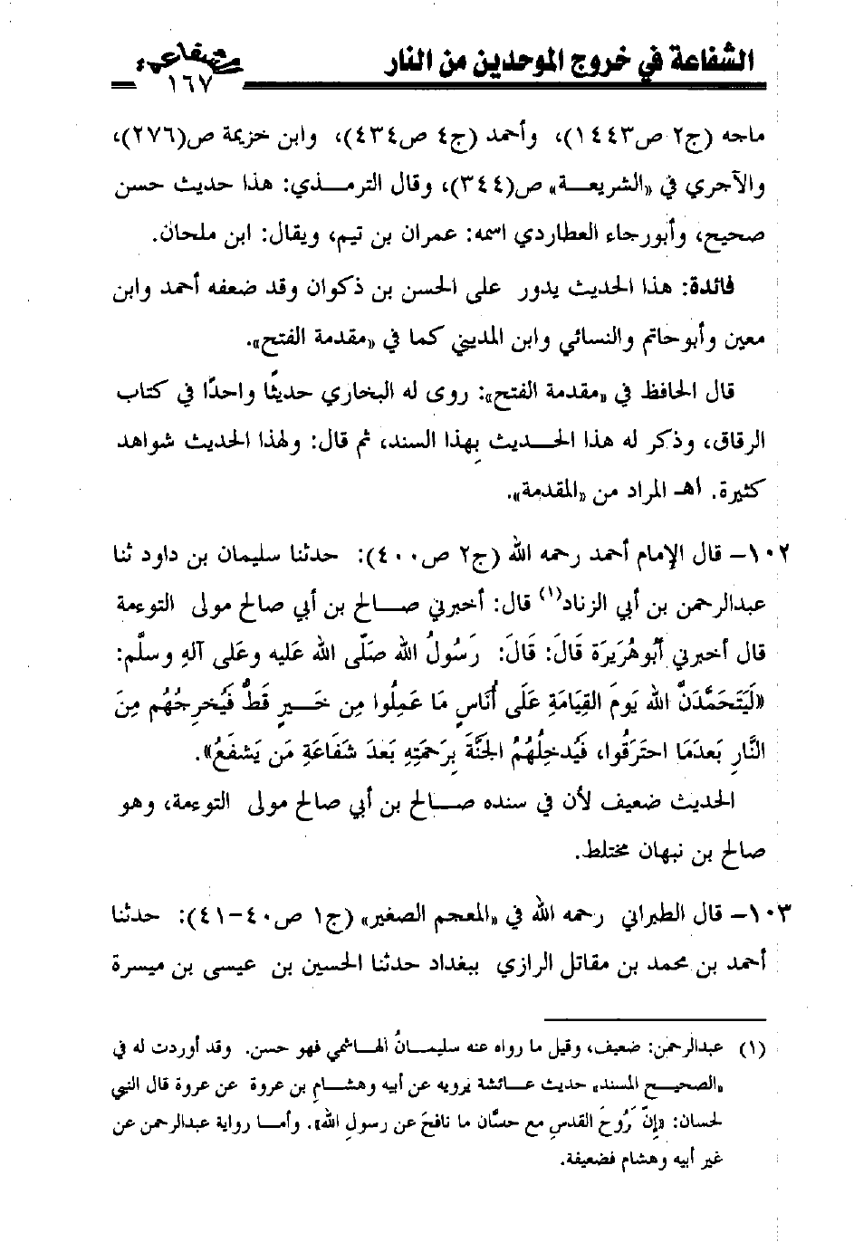 102 - قال الإمام أحمد رحمه الله (ج2 ص400): حدثنا سليمان بن داود ثنا عبد الرحمن بن أبي الزناد (¬1) قال: أخبرني صالح بن أبي صالح مولى التوءمة قال أخبرني أبوهريرة قال: قال: رسول الله صلّى الله عليه وعلى آله وسلّم: ((ليتحمّدنّ الله يوم القيامة على أناس ما عملوا من خير قطّ فيخرجهم من النّار بعدما احترقوا، فيدخلهم الجنّة برحمته بعد شفاعة من يشفع)).