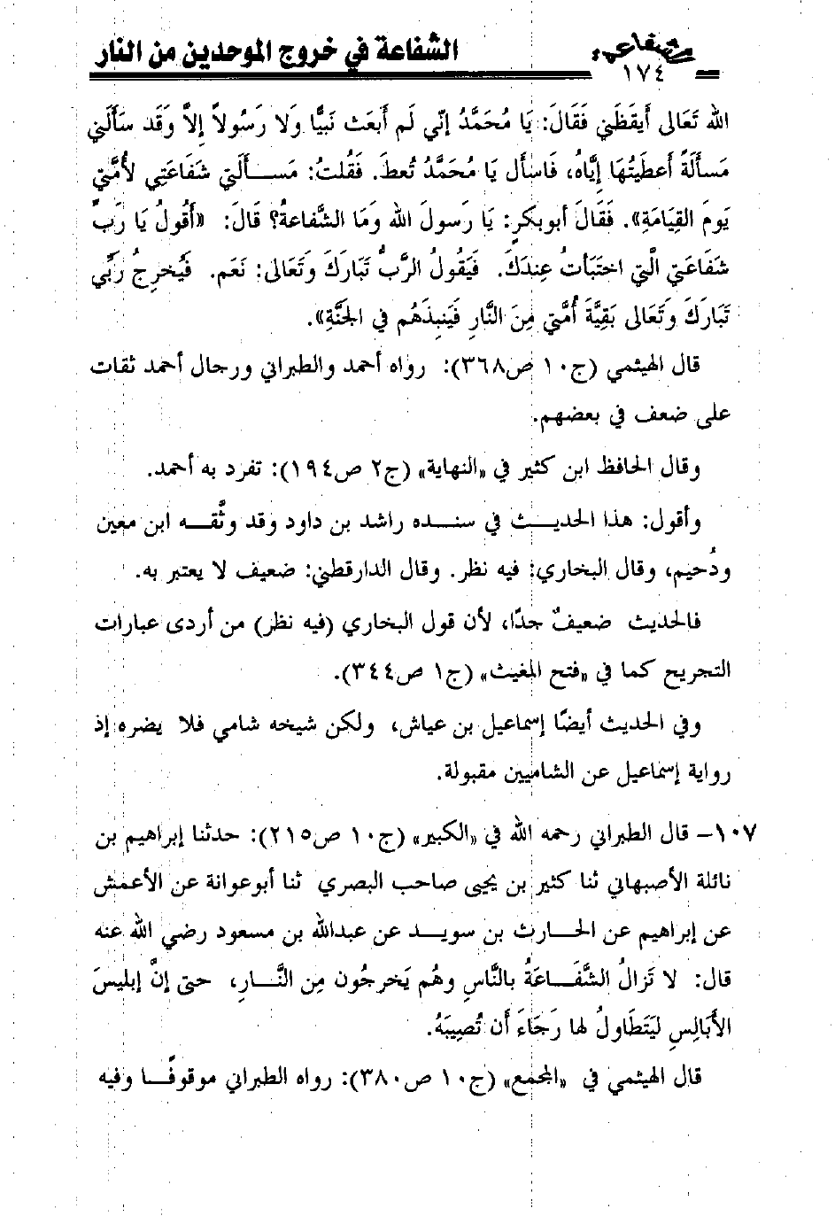 107 - قال الطبراني رحمه الله في "الكبير" (ج10 ص215): حدثنا إبراهيم بن نائلة الأصبهاني ثنا كثير بن يحيى صاحب البصري ثنا أبوعوانة عن الأعمش عن إبراهيم عن الحارث بن سويد عن عبد الله بن مسعود رضي الله عنه قال: لا تزال الشّفاعة بالنّاس وهم يخرجون من النّار، حتى إنّ إبليس الأبالس ليتطاول لها رجاء أن تصيبه.