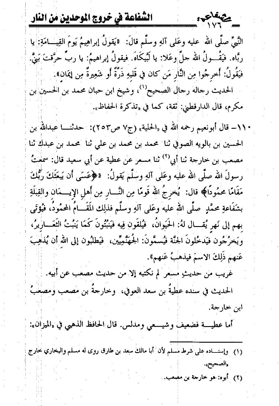 110 - قال أبونعيم رحمه الله في "الحلية" (ج7 ص253): حدثنا عبد الله بن الحسين بن بالويه الصوفي ثنا محمد بن محمد بن علي ثنا محمد بن عبدك ثنا مصعب بن خارجة ثنا أبي (¬2) ثنا مسعر عن عطية عن أبي سعيد قال: سمعت رسول الله صلّى الله عليه وعلى آله وسلّم يقول: {((عسى أن يبعثك ربّك مقامًا محمودًا} قال: يخرج الله قومًا من النّار من أهل الإيمان والقبلة بشفاعة محمّد صلّى الله عليه وعلى آله وسلّم فذلك المقام المحمود، فيؤتى بهم إلى نهر يقال له: الحيوان، فيلقون فيه فينبتون كما ينبت الثعارير، ويخرجون فيدخلون الجنّة فيسمّون: الجهنّميّين، فيطلبون إلى الله أن يذهب عنهم ذلك الاسم فيذهب عنهم)).