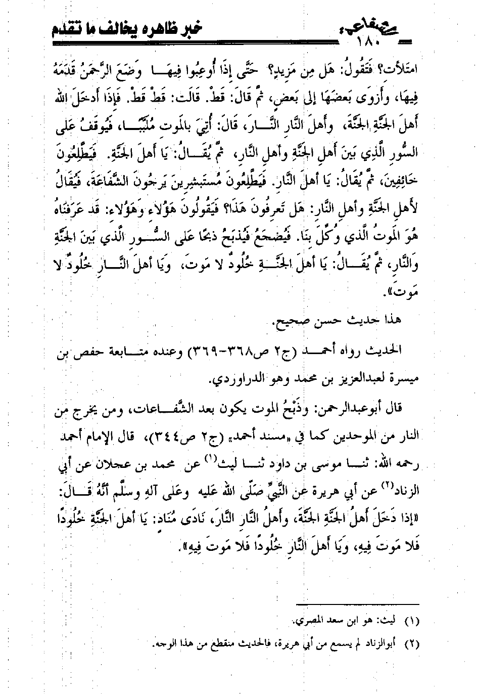 قال أبوعبد الرحمن: وذبْح الموت يكون بعد الشّفاعات، ومن يخرج من النار من الموحدين كما في "مسند أحمد" (ج2 ص344)، قال الإمام أحمد رحمه الله: ثنا موسى بن داود ثنا ليث (¬1) عن محمد بن عجلان عن أبي الزناد (¬2) عن أبي هريرة عن النّبيّ صلّى الله عليه وعلى آله وسلّم أنّه قال: ((إذا دخل أهل الجنّة الجنّة، وأهل النّار النّار، نادى مناد: يا أهل الجنّة خلودًا فلا موت فيه، ويا أهل النّار خلودًا فلا موت فيه)).