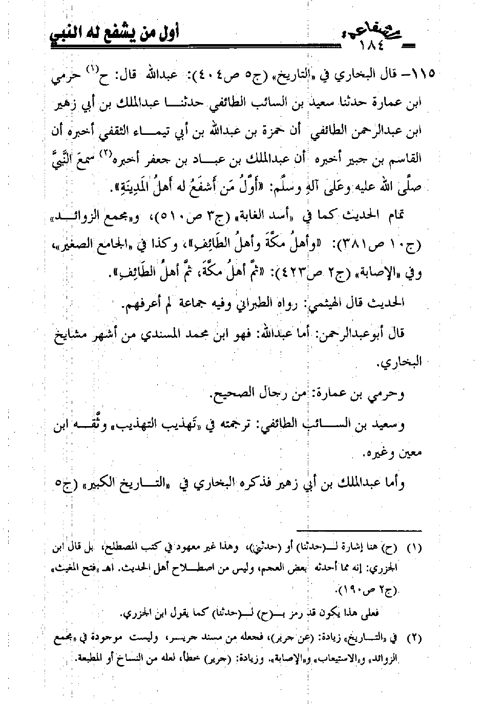 115 - قال البخاري في "التاريخ" (ج5 ص404): عبد الله قال: ح (¬1) حرمي ابن عمارة حدثنا سعيد بن السائب الطائفي حدثنا عبد الملك بن أبي زهير ابن عبد الرحمن الطائفي أن حمزة بن عبد الله بن أبي تيماء الثقفي أخبره أن القاسم بن جبير أخبره أن عبد الملك بن عباد بن جعفر أخبره (¬2) سمع النّبيّ صلّى الله عليه وعلى آله وسلّم: ((أوّل من أشفع له أهل المدينة)).