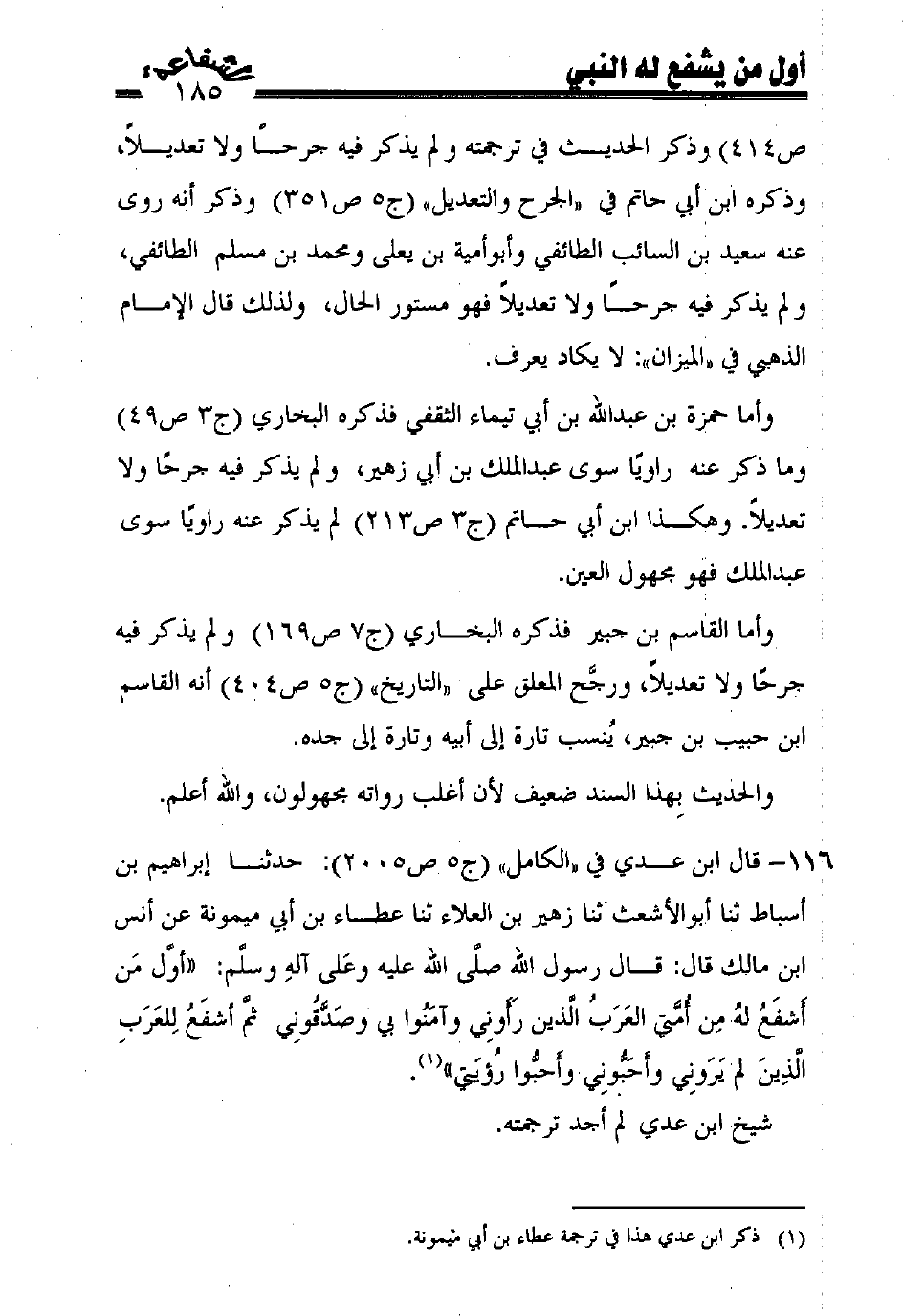 116 - قال ابن عدي في "الكامل" (ج5 ص2005): حدثنا إبراهيم بن أسباط ثنا أبوالأشعث ثنا زهير بن العلاء ثنا عطاء بن أبي ميمونة عن أنس ابن مالك قال: قال رسول الله صلّى الله عليه وعلى آله وسلّم: ((أوّل من أشفع له من أمّتي العرب الّذين رأوني وآمنوا بي وصدّقوني ثمّ أشفع للعرب الّذين لم يروني وأحبّوني وأحبّوا رؤيتي)) (¬1).