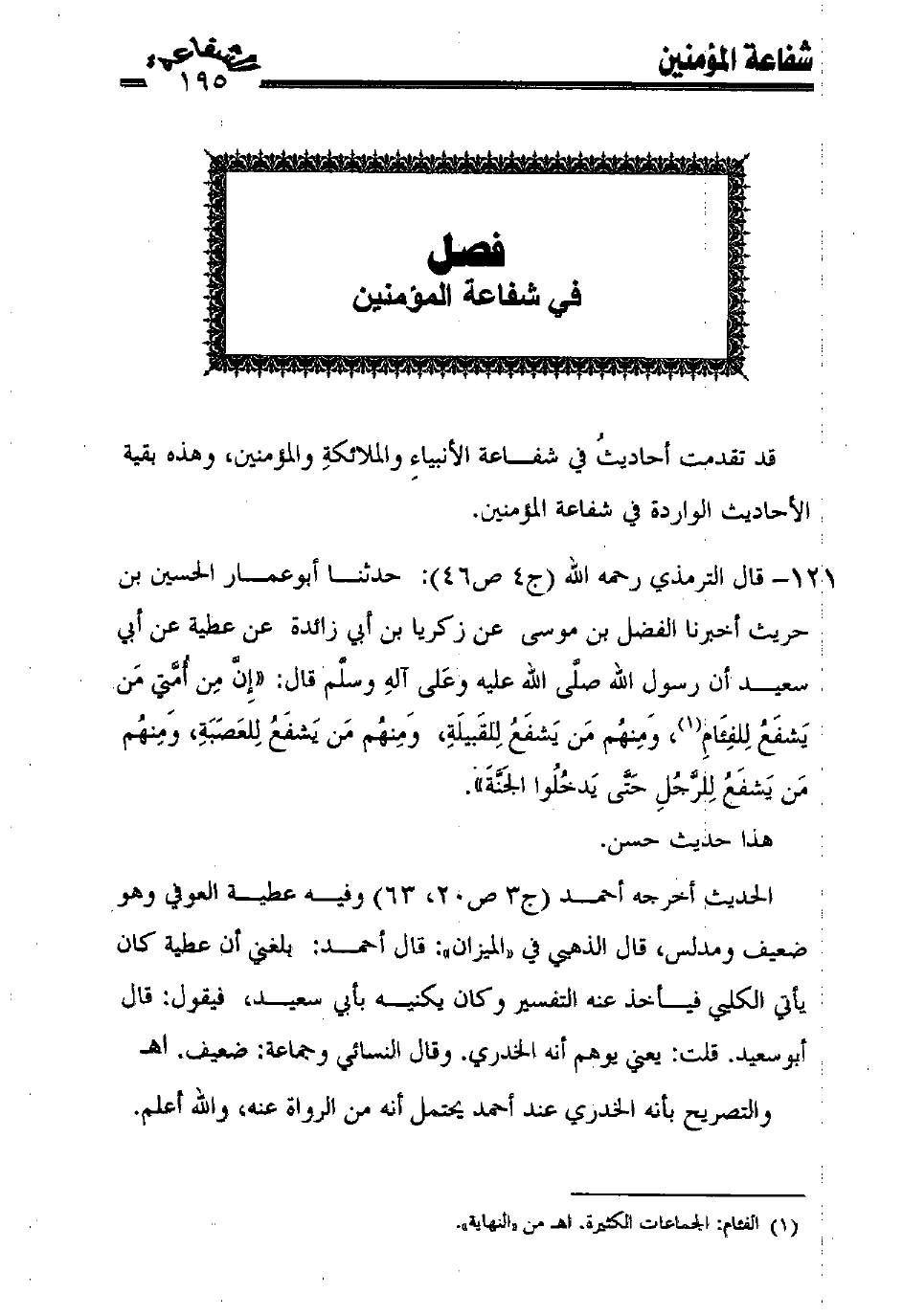 121 - قال الترمذي رحمه الله (ج4 ص46): حدثنا أبوعمار الحسين بن حريث أخبرنا الفضل بن موسى عن زكريا بن أبي زائدة عن عطية عن أبي سعيد أن رسول الله صلّى الله عليه وعلى آله وسلّم قال: ((إنّ من أمّتي من يشفع للفئام (¬1)، ومنهم من يشفع للقبيلة، ومنهم من يشفع للعصبة، ومنهم من يشفع للرّجل حتّى يدخلوا الجنّة)).