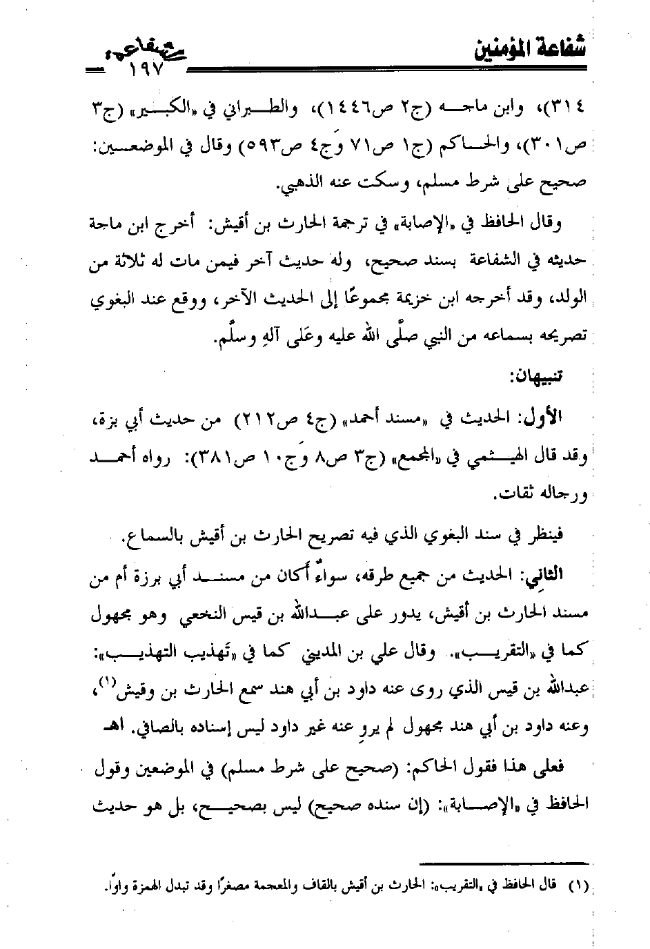 وقال الحافظ في "الإصابة" في ترجمة الحارث بن أقيش: أخرج ابن ماجة حديثه في الشفاعة بسند صحيح، وله حديث آخر فيمن مات له ثلاثة من الولد، وقد أخرجه ابن خزيمة مجموعًا إلى الحديث الآخر، ووقع عند البغوي تصريحه بسماعه من النبي صلّى الله عليه وعلى آله وسلّم.