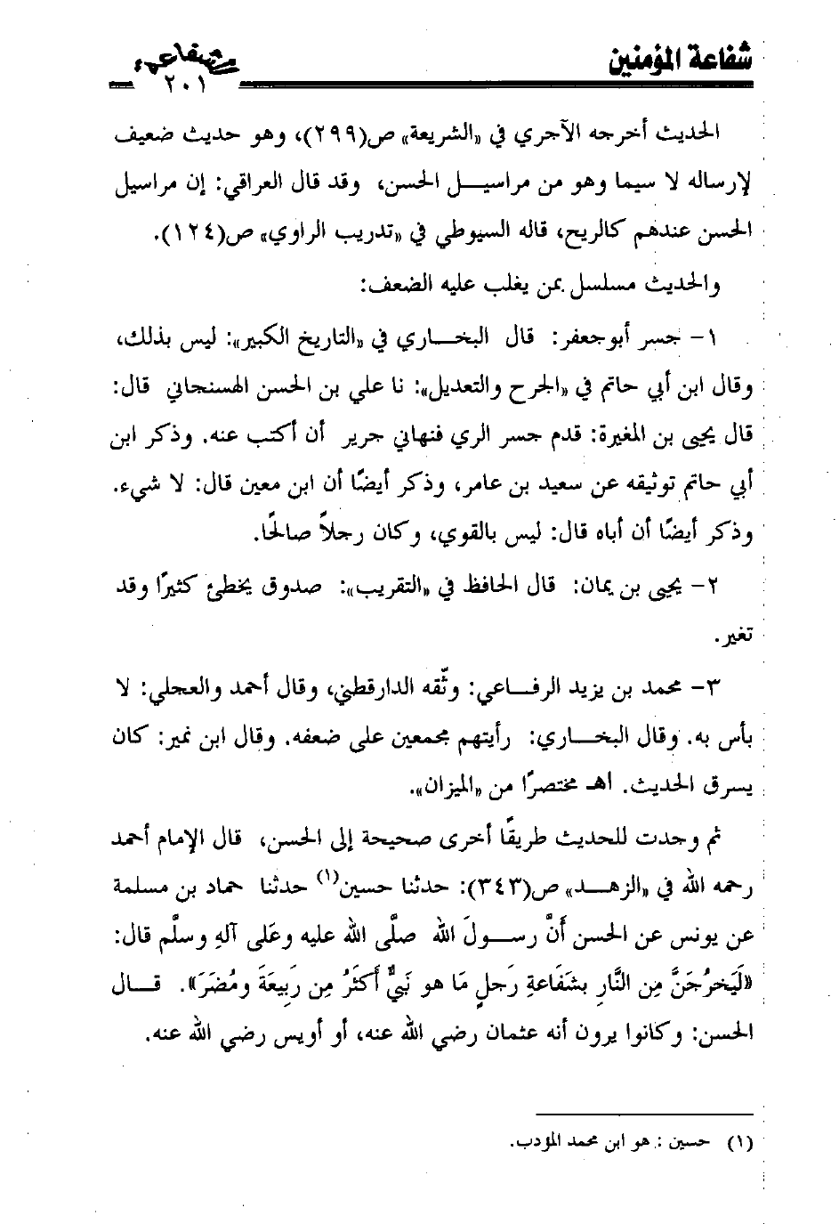 ثم وجدت للحديث طريقًا أخرى صحيحة إلى الحسن، قال الإمام أحمد رحمه الله في "الزهد" ص (343): حدثنا حسين (¬1) حدثنا حماد بن مسلمة عن يونس عن الحسن أنّ رسول الله صلّى الله عليه وعلى آله وسلّم قال: ((ليخرجنّ من النّار بشفاعة رجل ما هو نبيّ أكثر من ربيعة ومضر)). قال الحسن: وكانوا يرون أنه عثمان رضي الله عنه، أو أويس رضي الله عنه.