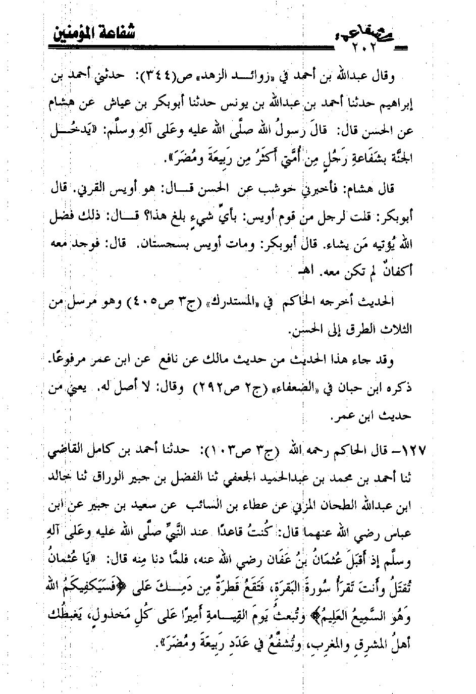 127 - قال الحاكم رحمه الله (ج3 ص103): حدثنا أحمد بن كامل القاضي ثنا أحمد بن محمد بن عبد الحميد الجعفي ثنا الفضل بن جبير الوراق ثنا خالد ابن عبد الله الطحان المزني عن عطاء بن السائب عن سعيد بن جبير عن ابن عباس رضي الله عنهما قال: كنت قاعدًا عند النّبيّ صلّى الله عليه وعلى آله وسلّم إذ أقبل عثمان بن عفان رضي الله عنه، فلمّا دنا منه قال: ((يا عثمان تقتل وأنت تقرأ سورة البقرة، فتقع قطرة من دمك على {فسيكفيكم الله وهو السّميع العليم} وتبعث يوم القيامة أميرًا على كل مخذول، يغبطك أهل المشرق والمغرب، وتشفّع في عدد ربيعة ومضر)).