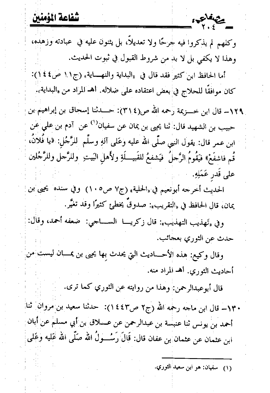 129 - قال ابن خزيمة رحمه الله ص (314): حدثنا إسحاق بن إبراهيم بن حبيب بن الشهيد قال: ثنا يحيى بن يمان عن سفيان (¬1) عن آدم بن علي عن ابن عمر قال: يقول النبي صلّى الله عليه وعلى آله وسلّم للرّجل: ((يا فلان، قم فاشفعْ)) فيقوم الرّجل فيشفع للقبيلة ولأهل البيت وللرّجل وللرّجلين على قدر عمله.