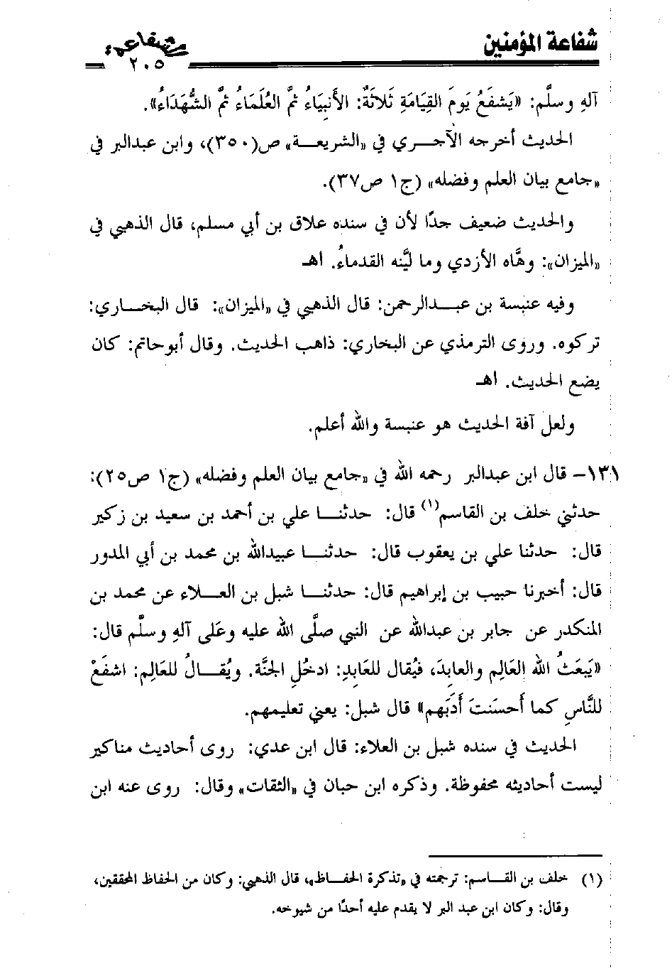 131 - قال ابن عبد البر رحمه الله في "جامع بيان العلم وفضله" (ج1 ص25): حدثني خلف بن القاسم (¬1) قال: حدثنا علي بن أحمد بن سعيد بن زكير قال: حدثنا علي بن يعقوب قال: حدثنا عبيد الله بن محمد بن أبي المدور قال: أخبرنا حبيب بن إبراهيم قال: حدثنا شبل بن العلاء عن محمد بن المنكدر عن جابر بن عبد الله عن النبي صلّى الله عليه وعلى آله وسلّم قال: ((يبعث الله العالم والعابد، فيقال للعابد: ادخل الجنّة. ويقال للعالم: اشفعْ للنّاس كما أحسنت أدبهم)) قال شبل: يعني تعليمهم.