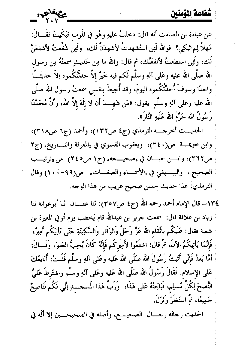 134 - قال الإمام أحمد رحمه الله (ج4 ص357): ثنا عفان ثنا أبوعوانة ثنا زياد بن علاقة قال: سمعت جرير بن عبد الله قام يخطب يوم توفي المغيرة بن شعبة فقال: عليكم باتّقاء الله عزّ وجلّ والوقار والسّكينة حتّى يأتيكم أمير، فإنّما يأتيكم الآن، ثمّ قال: اشفعوا لأميركم فإنّه كان يحبّ العفو، وقال: أمّا بعد فإنّي أتيت رسول الله صلّى الله عليه وعلى آله وسلّم فقلت: أبايعك على الإسلام. فقال رسول الله صلّى الله عليه وعلى آله وسلّم واشترط عليّ النّصح لكلّ مسلم، فبايعته على هذا، وربّ هذا المسجد إنّي لكم لناصح جميعًا، ثمّ استغفر ونزل.