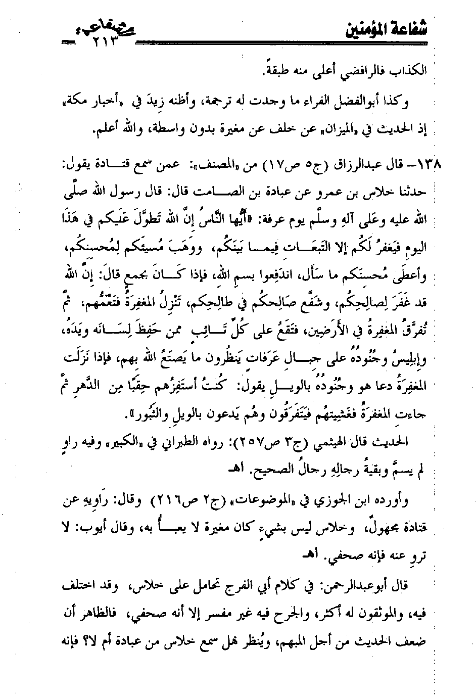138 - قال عبد الرزاق (ج5 ص17) من "المصنف": عمن سمع قتادة يقول: حدثنا خلاس بن عمرو عن عبادة بن الصامت قال: قال رسول الله صلّى الله عليه وعلى آله وسلّم يوم عرفة: ((أيّها النّاس إنّ الله تطوّل عليكم في هذا اليوم فيغفر لكم إلا التبعات فيما بينكم، ووهب مسيئكم لمحسنكم، وأعطى محسنكم ما سأل، اندفعوا بسم الله، فإذا كان بجمع قال: إنّ الله قد غفر لصالحكم، وشفّع صالحكم في طالحكم، تنْزل المغفرة فتعمّهم، ثمّ تفرّق المغفرة في الأرضين، فتقع على كلّ تائب ممن حفظ لسانه ويده، وإبليس وجنوده على جبال عرفات ينظرون ما يصنع الله بهم، فإذا نزلت المغفرة دعا هو وجنوده بالويل يقول: كنت أستفزهم حقبًا من الدّهر ثمّ جاءت المغفرة فغشيتهم فيتفرقون وهم يدعون بالويل والثبور)).