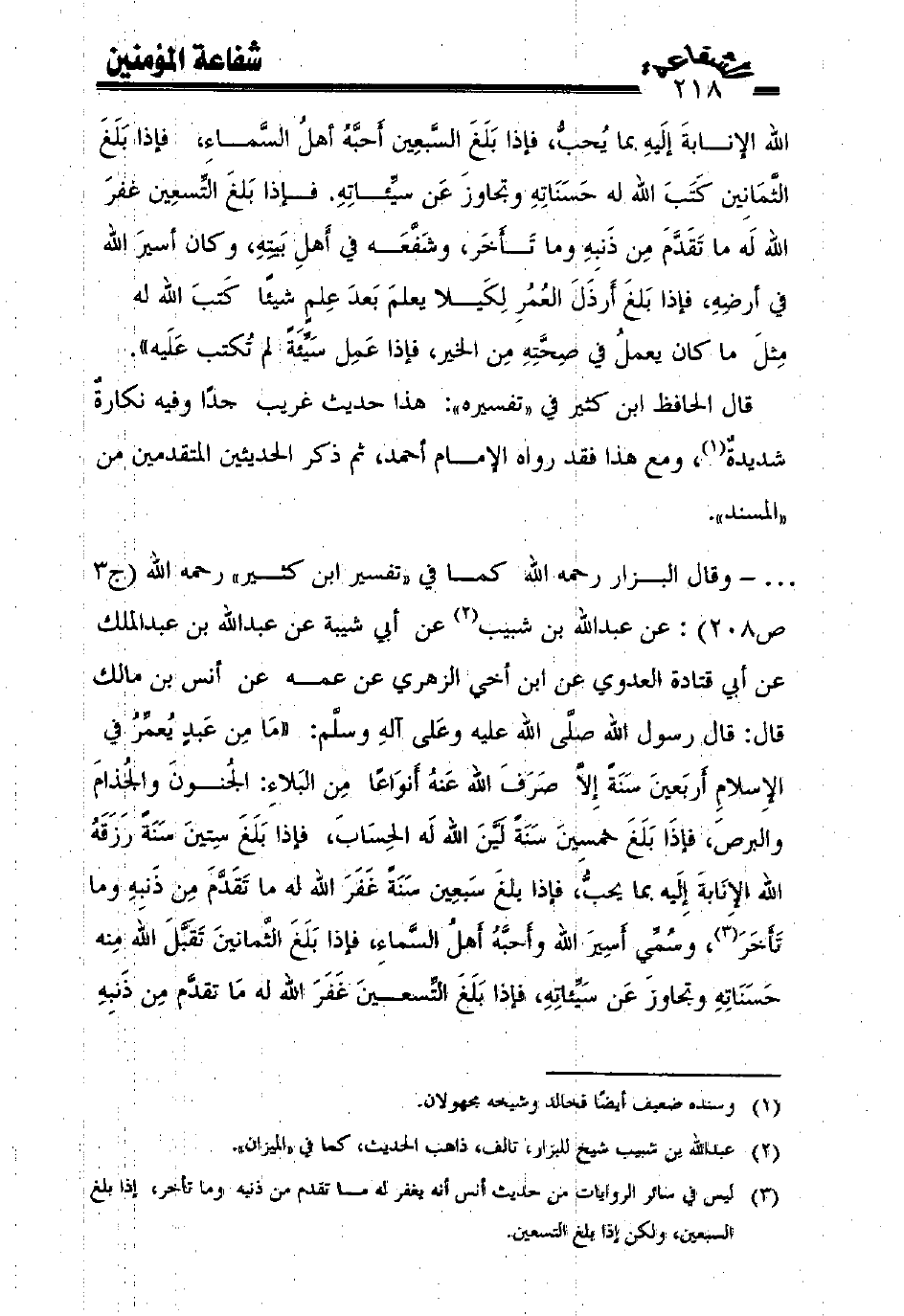 (¬3) ليس في سائر الروايات من حديث أنس أنه يغفر له ما تقدم من ذنبه وما تأخر، إذا بلغ السبعين، ولكن إذا بلغ التسعين.