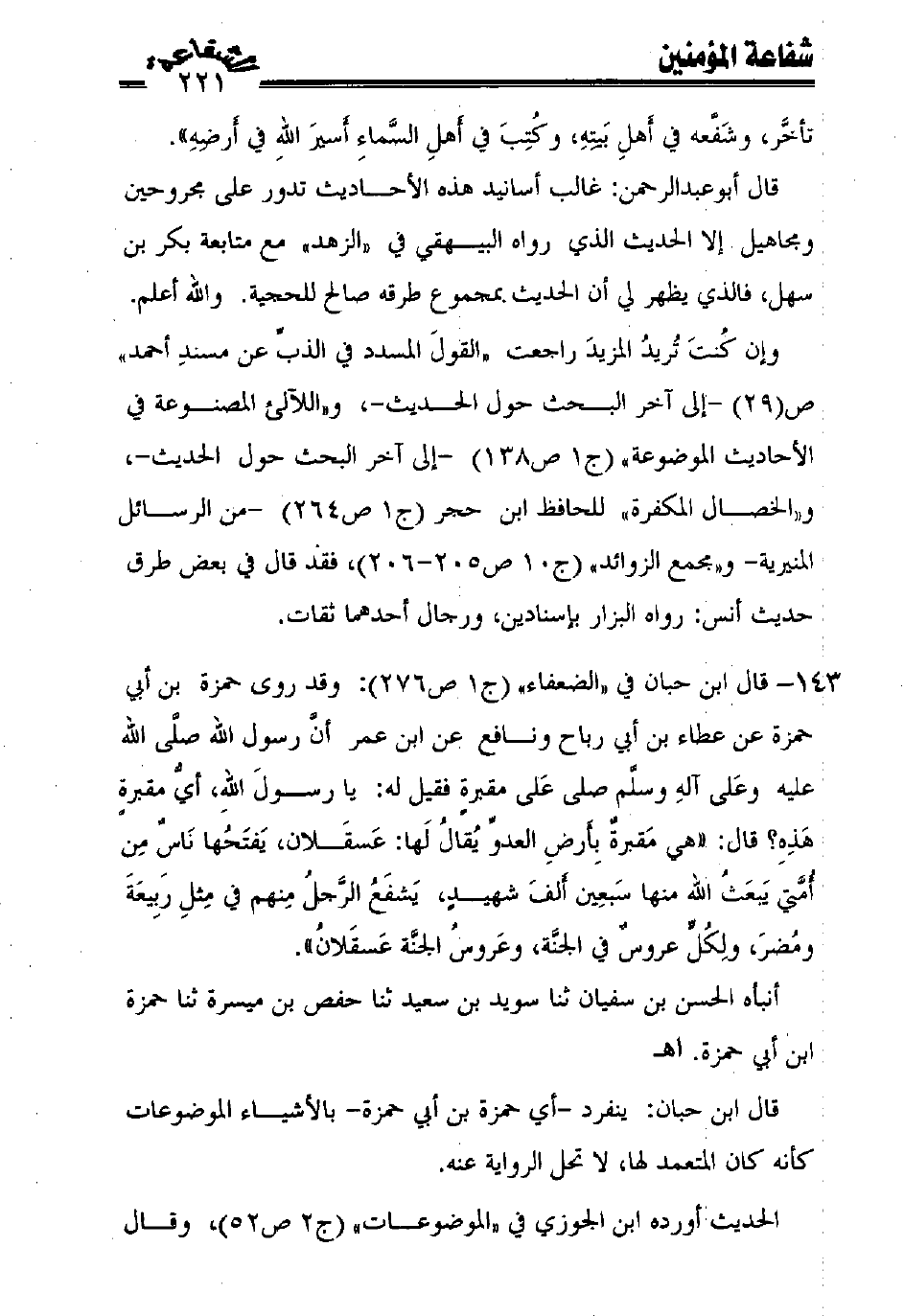 143 - قال ابن حبان في "الضعفاء" (ج1 ص276): وقد روى حمزة بن أبي حمزة عن عطاء بن أبي رباح ونافع عن ابن عمر أنّ رسول الله صلّى الله عليه وعلى آله وسلّم صلى على مقبرة فقيل له: يا رسول الله، أيّ مقبرة هذه؟ قال: ((هي مقبرة بأرض العدوّ يقال لها: عسقلان، يفتحها ناس من أمّتي يبعث الله منها سبعين ألف شهيد، يشفع الرّجل منهم في مثل ربيعة ومضر، ولكلّ عروس في الجنّة، وعروس الجنّة عسقلان)).