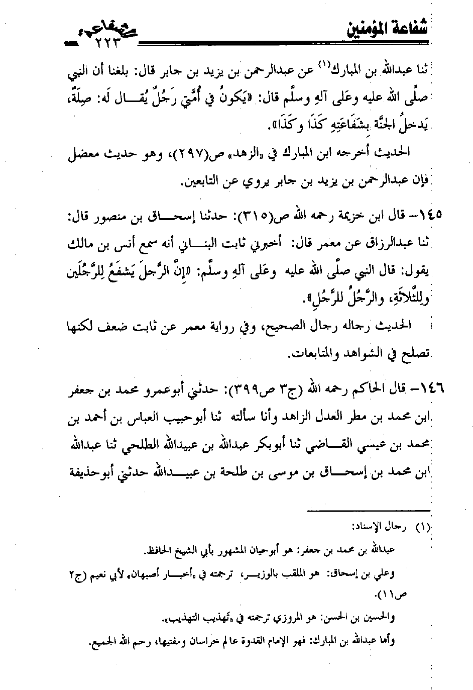 145 - قال ابن خزيمة رحمه الله ص (315): حدثنا إسحاق بن منصور قال: ثنا عبد الرزاق عن معمر قال: أخبرني ثابت البناني أنه سمع أنس بن مالك يقول: قال النبي صلّى الله عليه وعلى آله وسلّم: ((إنّ الرّجل يشفع للرّجلين وللثّلاثة، والرّجل للرّجل)).