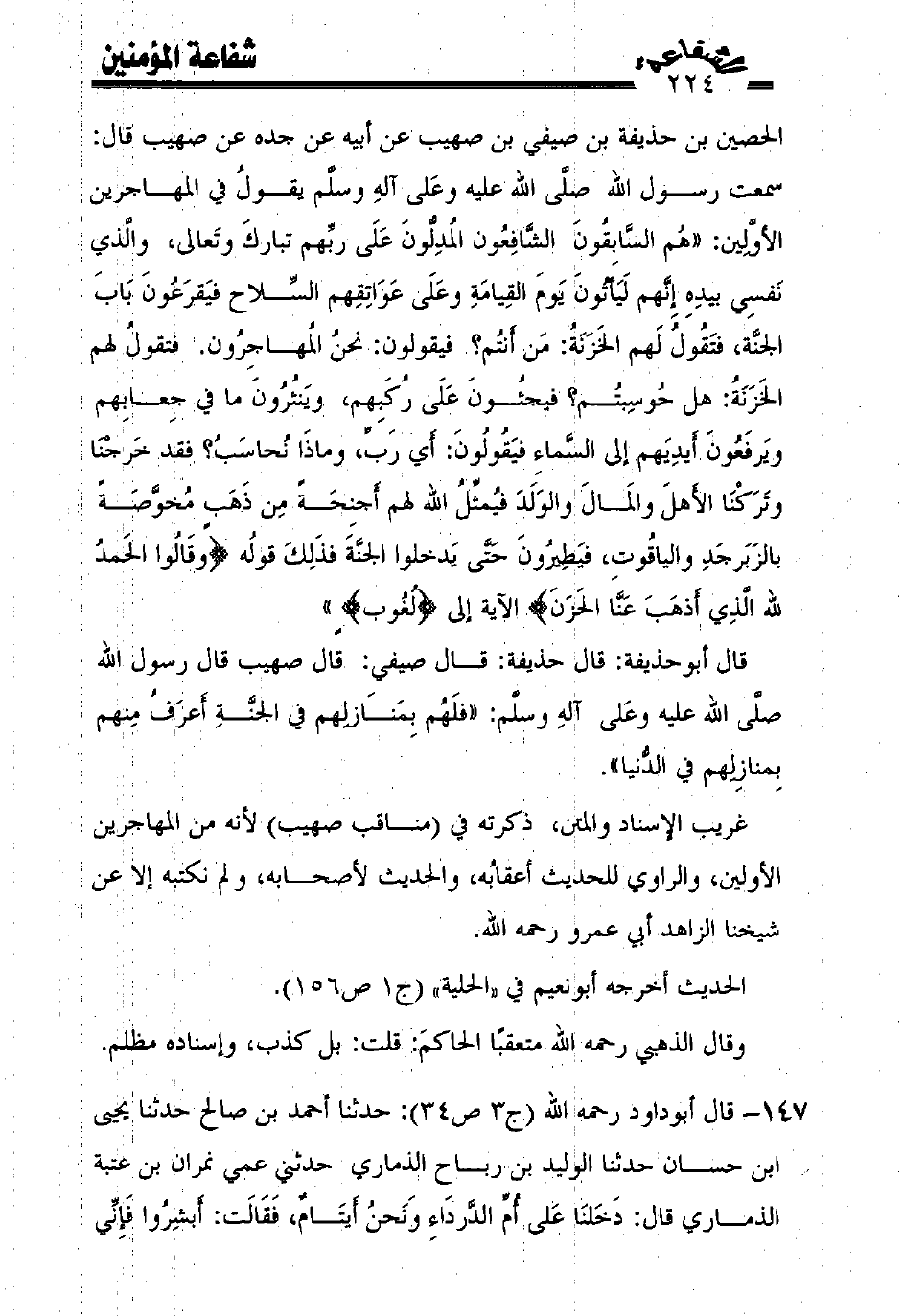الحصين بن حذيفة بن صيفي بن صهيب عن أبيه عن جده عن صهيب قال: سمعت رسول الله صلّى الله عليه وعلى آله وسلّم يقول في المهاجرين الأوّلين: ((هم السّابقون الشّافعون المدلّون على ربّهم تبارك وتعالى، والّذي نفسي بيده إنّهم ليأتون يوم القيامة وعلى عواتقهم السّلاح فيقرعون باب الجنّة، فتقول لهم الخزنة: من أنتم؟ فيقولون: نحن المهاجرون. فتقول لهم الخزنة: هل حوسبتم؟ فيجثون على ركبهم، وينثرون ما في جعابهم ويرفعون أيديهم إلى السّماء فيقولون: أي ربّ، وماذا نحاسب؟ فقد خرجْنا وتركْنا الأهل والمال والولد فيمثّل الله لهم أجنحةً من ذهب مخوّصةً بالزبرجد والياقوت، فيطيرون حتّى يدخلوا الجنّة فذلك قوله {وقالوا الحمد لله الّذي أذهب عنّا الحزن} الآية إلى {لغوب}))