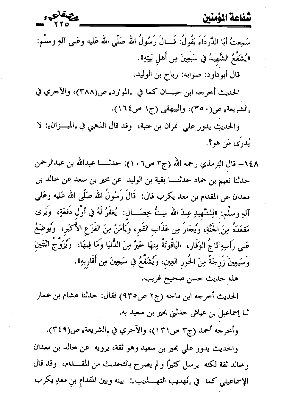 148 - قال الترمذي رحمه الله (ج3 ص106): حدثنا عبد الله بن عبد الرحمن حدثنا نعيم بن حماد حدثنا بقية بن الوليد عن بحير بن سعد عن خالد بن معدان عن المقدام بن معد يكرب قال: قال رسول الله صلّى الله عليه وعلى آله وسلّم: ((للشّهيد عند الله ستّ خصال: يغفر له في أوّل دفعة، ويرى مقعده من الجنّة، ويجار من عذاب القبر، ويأمن من الفزع الأكبر، ويوضع على رأسه تاج الوقار، الياقوتة منها خير من الدّنيا وما فيها، ويزوّج اثنتين وسبعين زوجةً من الحور العين، ويشفّع في سبعين من أقاربه)).