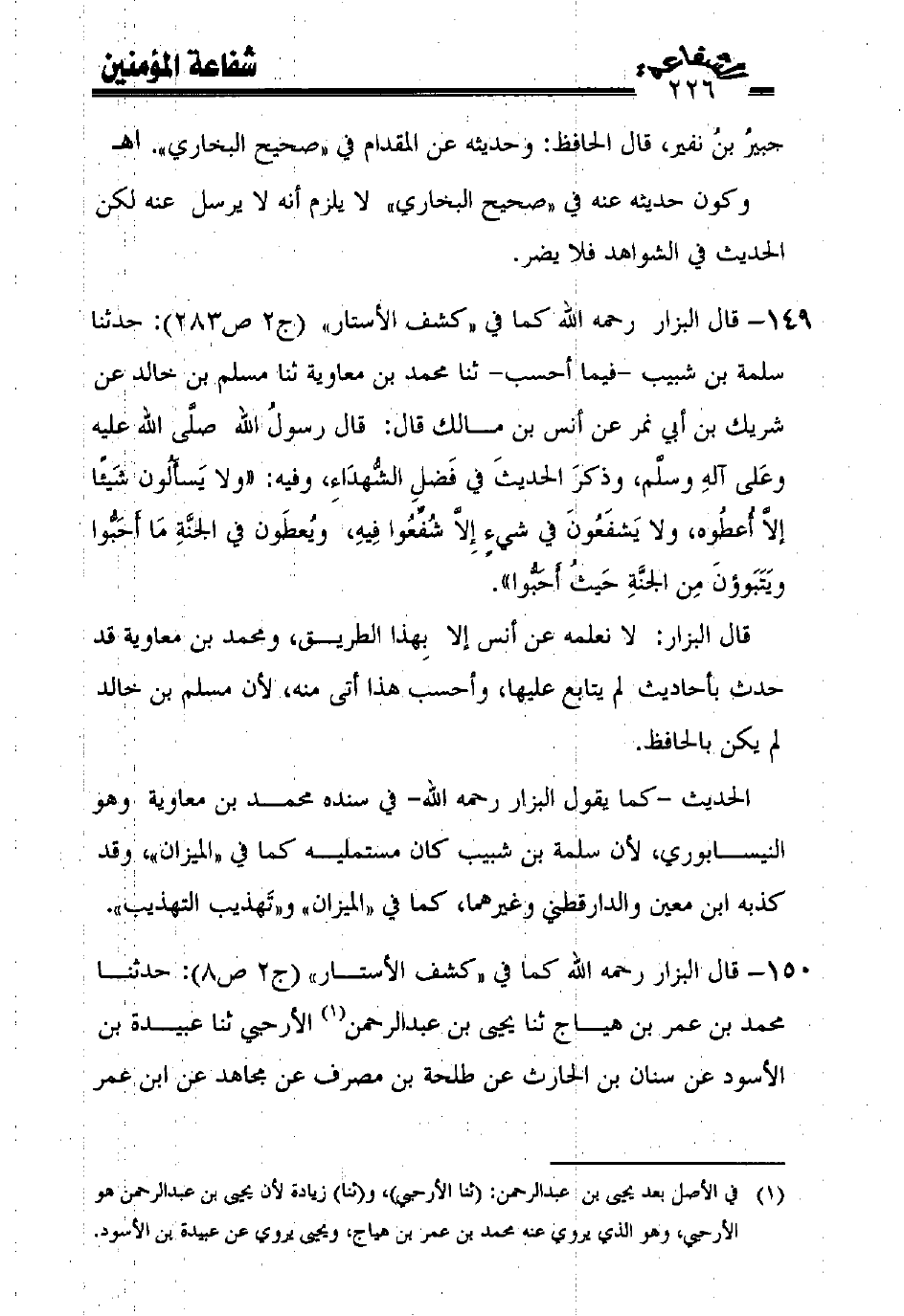 149 - قال البزار رحمه الله كما في "كشف الأستار" (ج2 ص283): حدثنا سلمة بن شبيب -فيما أحسب- ثنا محمد بن معاوية ثنا مسلم بن خالد عن شريك بن أبي نمر عن أنس بن مالك قال: قال رسول الله صلّى الله عليه وعلى آله وسلّم، وذكر الحديث في فضل الشّهداء، وفيه: ((ولا يسألون شيئًا إلاّ أعطوه، ولا يشفعون في شيء إلاّ شفّعوا فيه، ويعطون في الجنّة ما أحبّوا ويتبوؤن من الجنّة حيث أحبّوا)).
