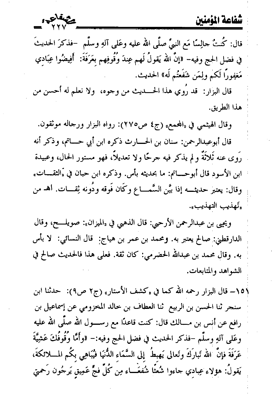151 - قال البزار رحمه الله كما في "كشف الأستار" (ج2 ص9): حدثنا ابن سنجر ثنا الحسن بن الربيع ثنا العطاف بن خالد المخزومي عن إسماعيل بن رافع عن أنس بن مالك قال: كنت قاعدًا مع رسول الله صلّى الله عليه وعلى آله وسلّم -فذكر الحديث في فضل الحج وفيه:- ((وأمّا وقوفك عشيّة عرفة فإنّ الله تبارك وتعالى يهبط إلى السّماء الدّنيا فيباهي بكم الملائكة، يقول: هؤلاء عبادي جاءوا شعثًا شفعاء من كلّ فجّ عميق يرجون رحمتي