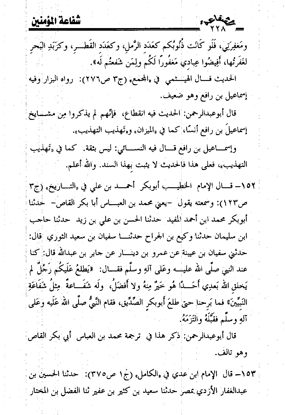 152 - قال الإمام الخطيب أبوبكر أحمد بن علي في "التاريخ" (ج3 ص123): وسمعته يقول -يعني محمد بن العباس أبا بكر القاص- حدثنا أبوبكر محمد ابن أحمد المفيد حدثنا الحسن بن علي بن زيد حدثنا حاجب ابن سليمان حدثنا وكيع بن الجراح حدثنا سفيان بن سعيد الثوري قال: حدثني سفيان بن عيينة عن عمرو بن دينار عن جابر بن عبد الله قال: كنا عند النبي صلّى الله عليه وعلى آله وسلّم فقال: ((يطلع عليكم رجل لم يخلق الله بعدي أحدًا هو خير منه ولا أفضل، وله شفاعة مثل شفاعة النبيّين)) فما برحنا حتى طلع أبوبكر الصّدّيق، فقام النّبيّ صلّى الله عليه وعلى آله وسلّم فقبّله والتزمه.
