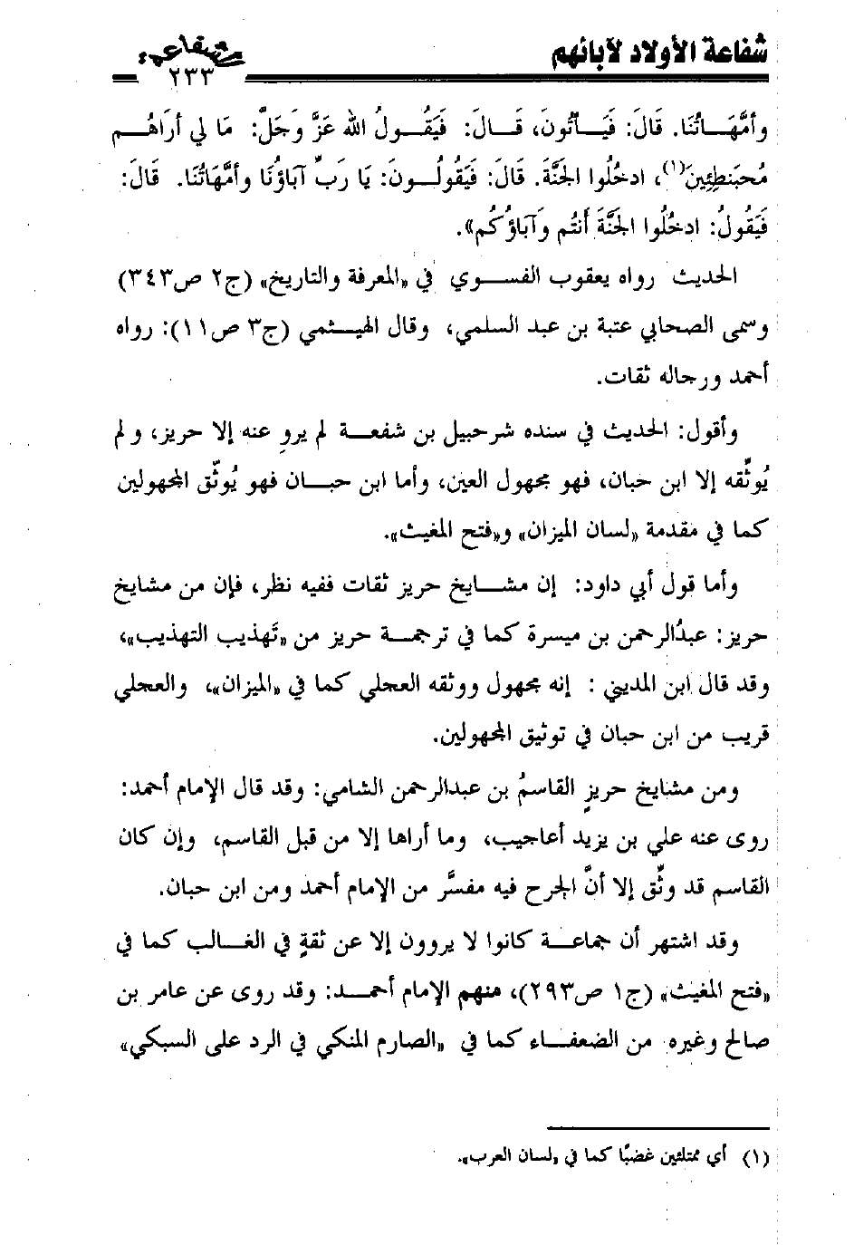 وأمّهاتنا. قال: فيأتون، قال: فيقول الله عزّ وجلّ: ما لي أراهم محبنطئين (¬1)، ادخلوا الجنّة. قال: فيقولون: يا ربّ آباؤنا وأمّهاتنا. قال: فيقول: ادخلوا الجنّة أنتم وآباؤكم)).