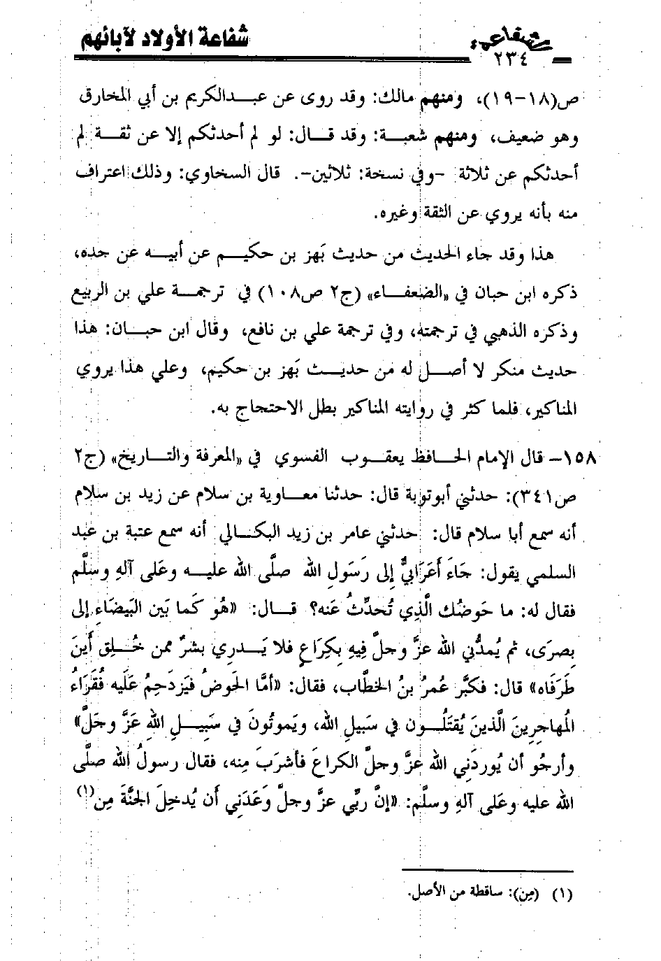158 - قال الإمام الحافظ يعقوب الفسوي في "المعرفة والتاريخ" (ج2 ص341): حدثني أبوتوبة قال: حدثنا معاوية بن سلام عن زيد بن سلام أنه سمع أبا سلام قال: حدثني عامر بن زيد البكالي أنه سمع عتبة بن عبد السلمي يقول: جاء أعرابيّ إلى رسول الله صلّى الله عليه وعلى آله وسلّم فقال له: ما حوضك الّذي تحدّث عنه؟ قال: ((هو كما بين البيضاء إلى بصرى، ثم يمدّني الله عزّ وجلّ فيه بكراع فلا يدري بشر ممن خلق أين طرفاه)) قال: فكبّر عمر بن الخطّاب، فقال: ((أمّا الحوض فيزدحم عليه فقراء المهاجرين الّذين يقتلون في سبيل الله، ويموتون في سبيل الله عزّ وجلّ)) وأرجو أن يوردني الله عزّ وجلّ الكراع فأشرب منه، فقال رسول الله صلّى الله عليه وعلى آله وسلّم: ((إنّ ربّي عزّ وجلّ وعدني أن يدخل الجنّة من (¬1)