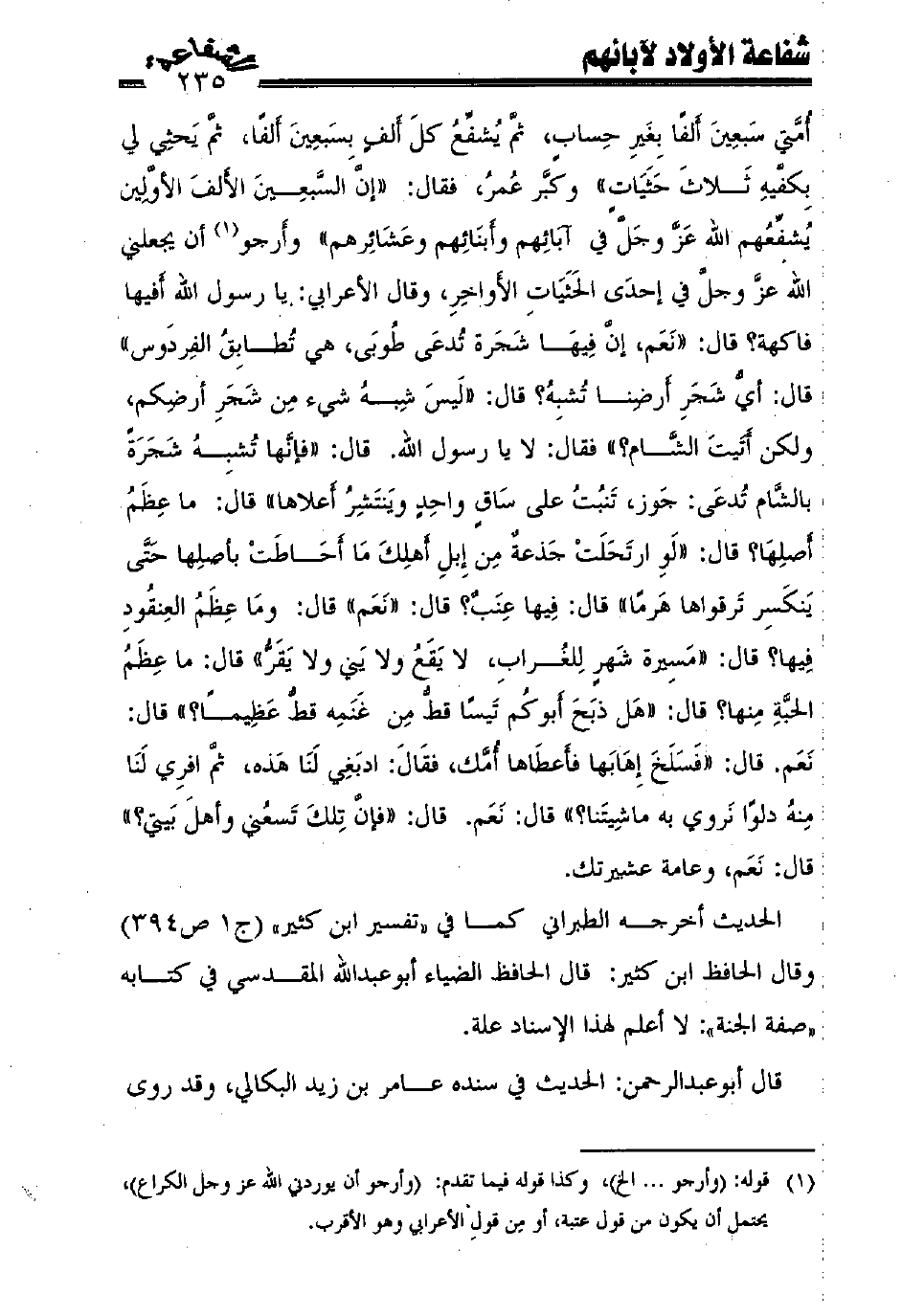 أمّتي سبعين ألفًا بغير حساب، ثمّ يشفّع كل ألف بسبعين ألفًا، ثمّ يحثي لي بكفّيه ثلاث حثيات)) وكبّر عمر، فقال: ((إنّ السّبعين الألف الأوّلين يشفّعهم الله عزّ وجلّ في آبائهم وأبنائهم وعشائرهم)) وأرجو (¬1) أن يجعلني الله عزّ وجلّ في إحدى الحثيات الأواخر، وقال الأعرابي: يا رسول الله أفيها فاكهة؟ قال: ((نعم، إنّ فيها شجرة تدعى طوبى، هي تطابق الفردوس)) قال: أيّ شجر أرضنا تشبه؟ قال: ((ليس شبه شيء من شجر أرضكم، ولكن أتيت الشّام؟)) فقال: لا يا رسول الله. قال: ((فإنّها تشبه شجرةً بالشّام تدعى: جوز، تنبت على ساق واحد وينتشر أعلاها)) قال: ما عظم أصلها؟ قال: ((لو ارتحلتْ جذعة من إبل أهلك ما أحاطتْ بأصلها حتّى ينكسر ترقواها هرمًا)) قال: فيها عنب؟ قال: ((نعم)) قال: وما عظم العنقود فيها؟ قال: ((مسيرة شهر للغراب، لا يقع ولا يني ولا يقرّ)) قال: ما عظم الحبّة منها؟ قال: ((هل ذبح أبوكم تيسًا قطّ من غنمه قطّ عظيمًا؟)) قال: نعم. قال: ((فسلخ إهابها فأعطاها أمّك، فقال: ادبغي لنا هذه، ثمّ افري لنا منه دلوًا نروي به ماشيتنا؟)) قال: نعم.