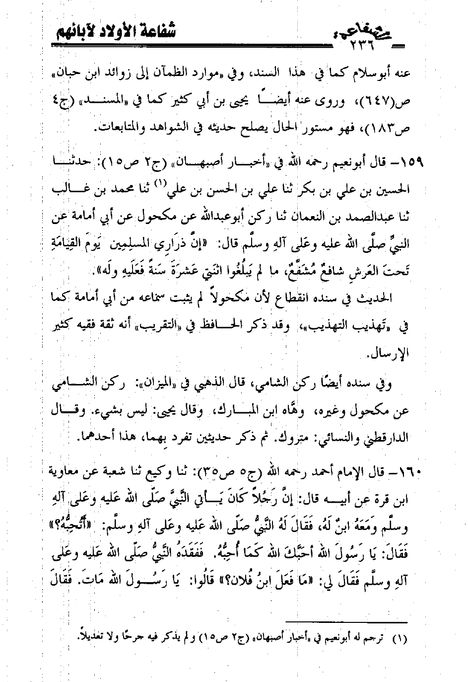 159 - قال أبونعيم رحمه الله في "أخبار أصبهان" (ج2 ص15): حدثنا الحسين بن علي بن بكر ثنا علي بن الحسن بن علي (¬1) ثنا محمد بن غالب ثنا عبد الصمد بن النعمان ثنا ركن أبوعبد الله عن مكحول عن أبي أمامة عن النبيّ صلّى الله عليه وعلى آله وسلّم قال: ((إنّ ذراري المسلمين يوم القيامة تحت العرش شافع مشفّع، ما لم يبلغوا اثنتي عشرة سنةً فعليه وله)).