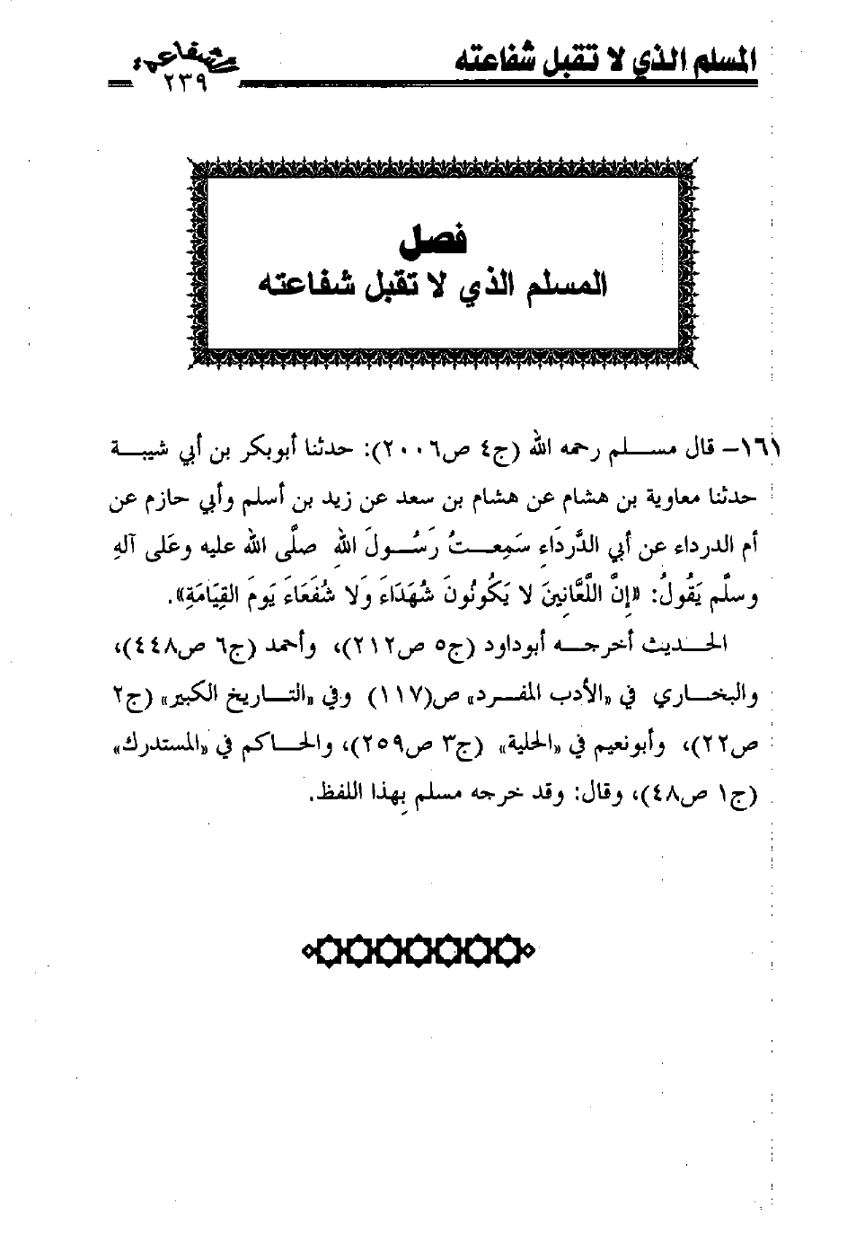 161 - قال مسلم رحمه الله (ج4 ص2006): حدثنا أبوبكر بن أبي شيبة حدثنا معاوية بن هشام عن هشام بن سعد عن زيد بن أسلم وأبي حازم عن أم الدرداء عن أبي الدّرداء سمعت رسول الله صلّى الله عليه وعلى آله وسلّم يقول: ((إنّ اللّعّانين لا يكونون شهداء ولا شفعاء يوم القيامة)).