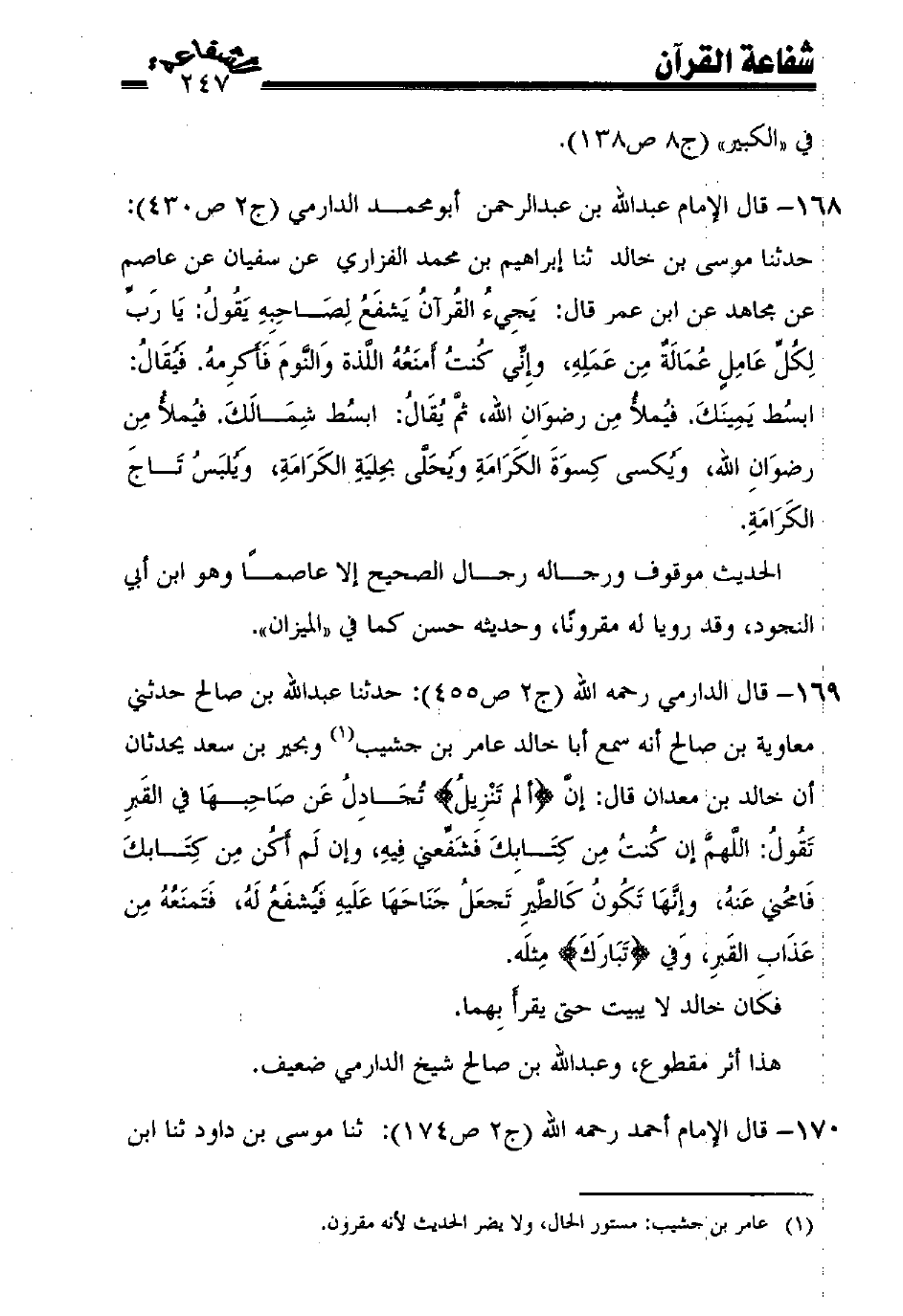 168 - قال الإمام عبد الله بن عبد الرحمن أبومحمد الدارمي (ج2 ص430): حدثنا موسى بن خالد ثنا إبراهيم بن محمد الفزاري عن سفيان عن عاصم عن مجاهد عن ابن عمر قال: يجيء القرآن يشفع لصاحبه يقول: يا ربّ لكلّ عامل عمالة من عمله، وإنّي كنت أمنعه اللّذة والنّوم فأكرمه. فيقال: ابسط يمينك. فيملأ من رضوان الله، ثمّ يقال: ابسط شمالك. فيملأ من رضوان الله، ويكسى كسوة الكرامة ويحلّى بحلية الكرامة، ويلبس تاج الكرامة.