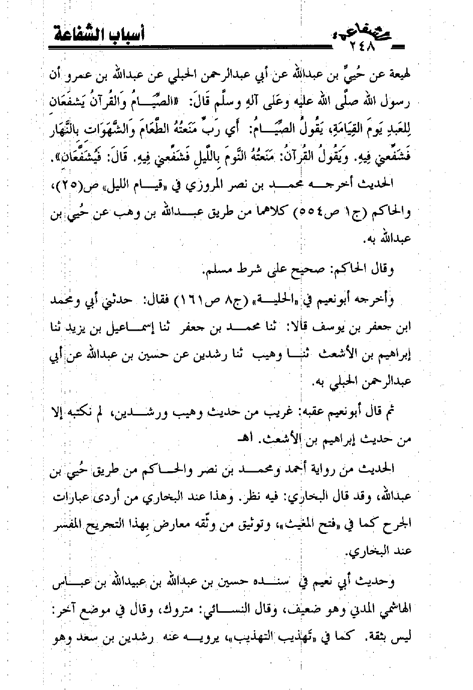 لهيعة عن حييّ بن عبد الله عن أبي عبد الرحمن الحبلي عن عبد الله بن عمرو أن رسول الله صلّى الله عليه وعلى آله وسلّم قال: ((الصّيام والقرآن يشفعان للعبد يوم القيامة، يقول الصّيام: أي ربّ منعته الطّعام والشّهوات بالنّهار فشفّعني فيه. ويقول القرآن: منعته النّوم باللّيل فشفّعني فيه. قال: فيشفّعان)).